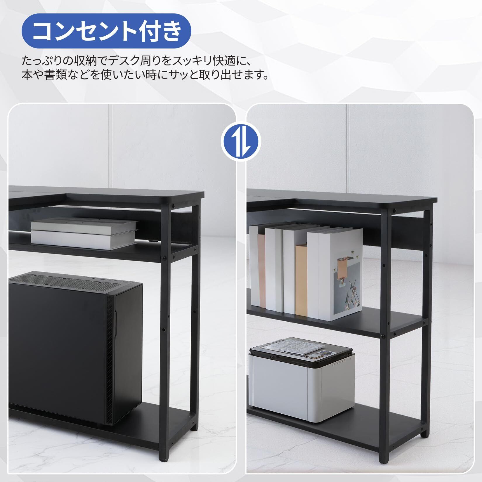 L字デスク パソコンデスク 左右組み換え可能 幅150cm奥行80cm高さ73cm コーナー机 ラックつき 棚高さ調節可能 プリンター台付き コンセント付き ゲーミングデスク 学習机 作業机 ワークデスク PCデスク 在宅勤務 (ブラック)