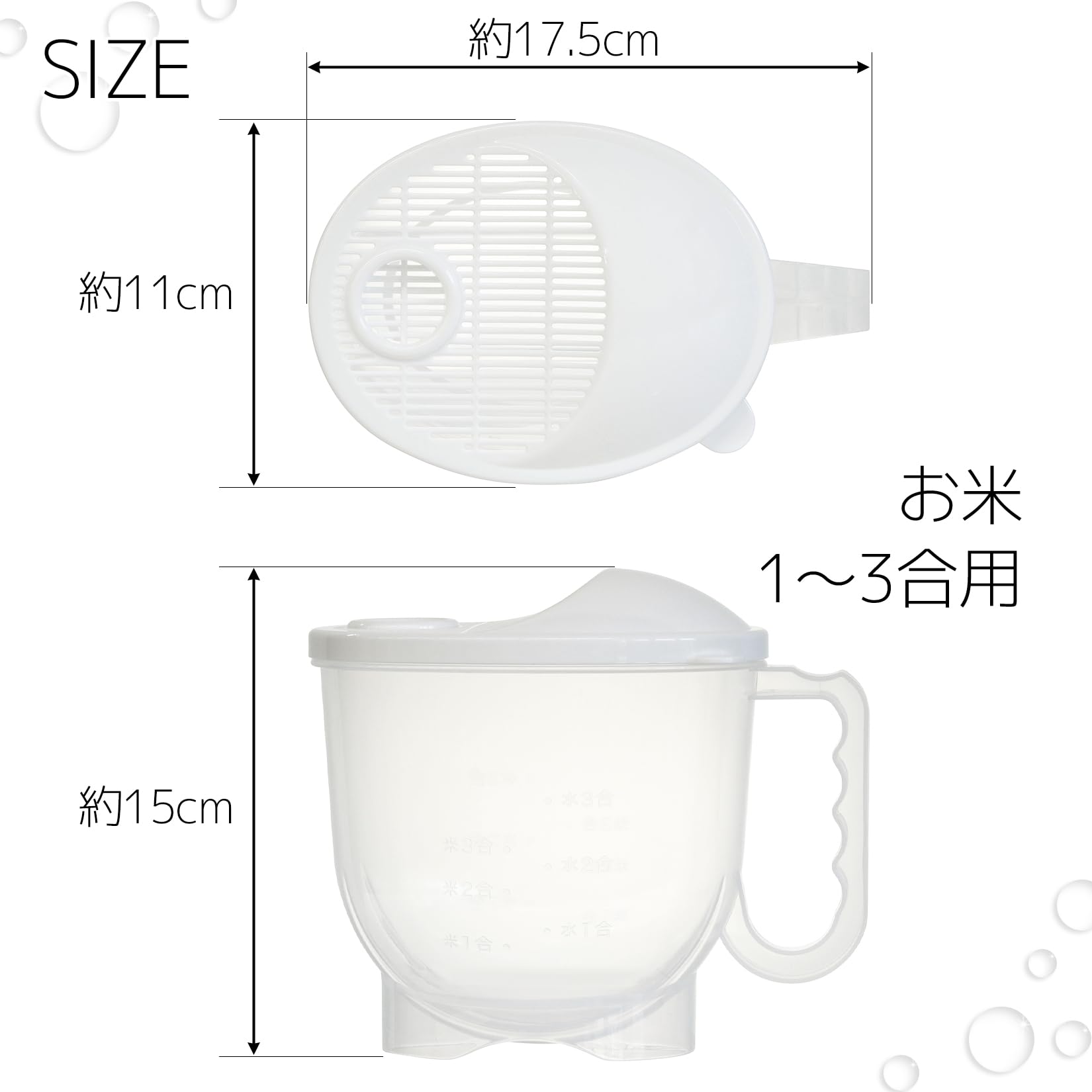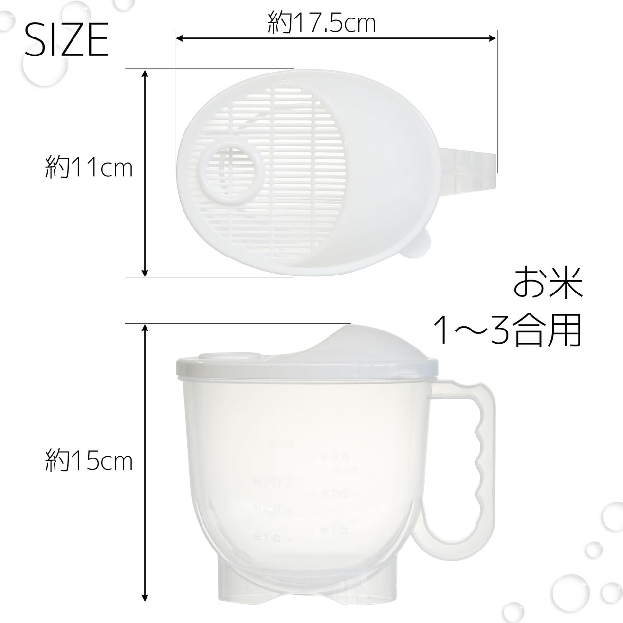 【サイズ】約幅11×奥行17.5×高さ15cm(米1~3合用) 【重量】約113g 【素材・材質】ポリプロピレン(BPAフリー) 【生産国】日本