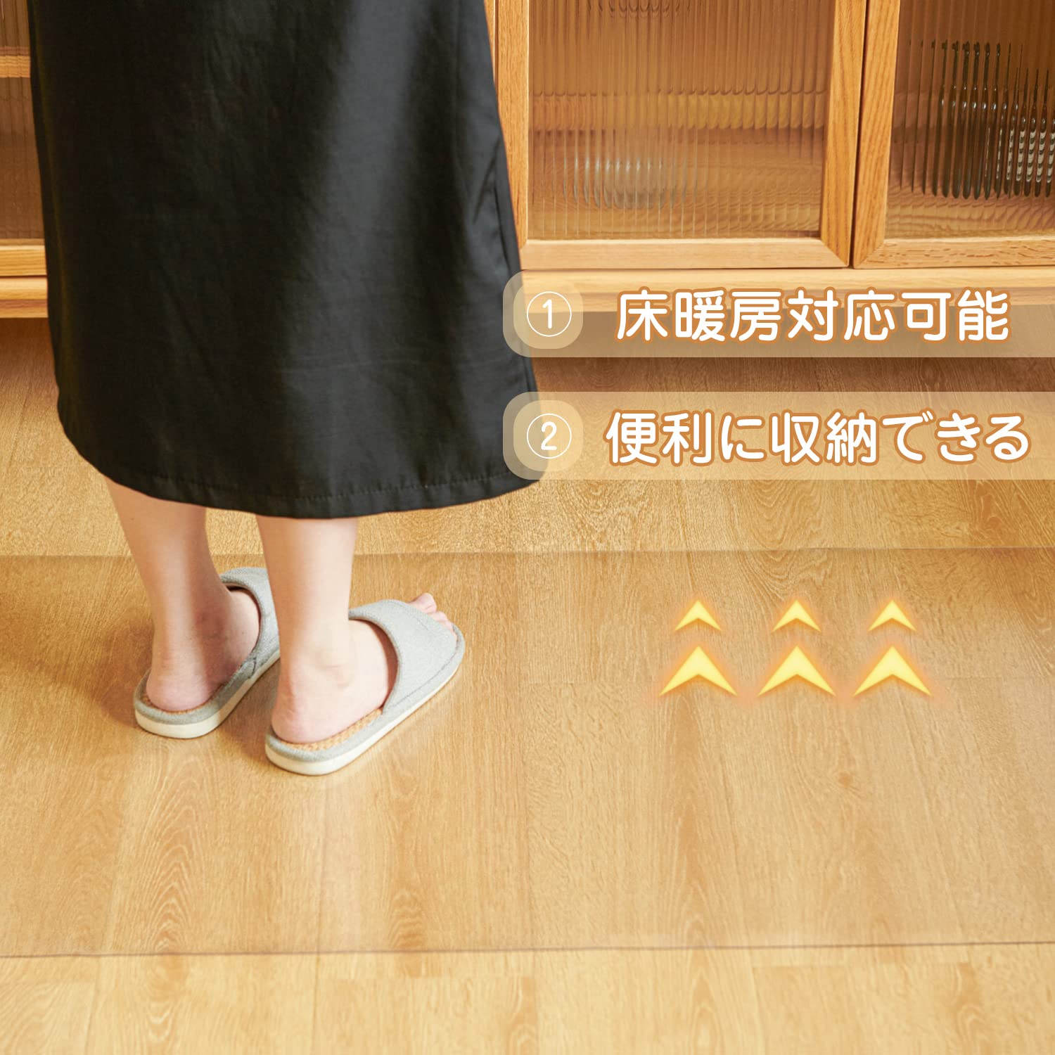 「お手入れ簡単」キッチンマットは汚れても雑巾で拭くだけでキレイになります。床暖房に対応可能なので、一年中使えます。また、使わない時は丸めて収納でき、とても便利です。