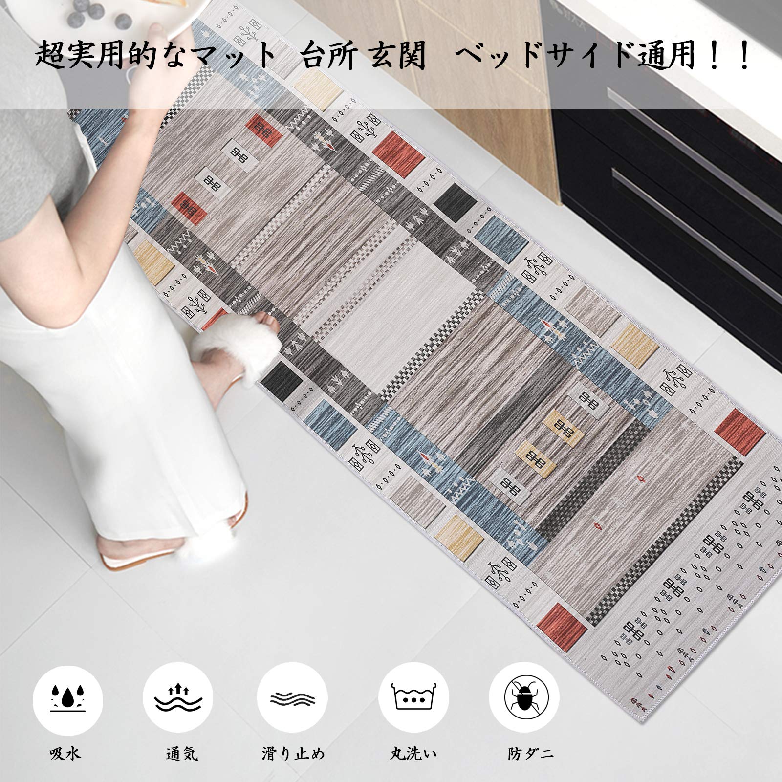 サイズ:44×120×0.6cm 表地:ポリエステル100% 裏面:不織布(滑り止め加工) 超吸水:キッチンマットはポリエステル繊維を採用し、空気との接触面積が大きく、水は急速に気化し、吸水性と防ダニ性能は抜群で、乾燥しやすいです。