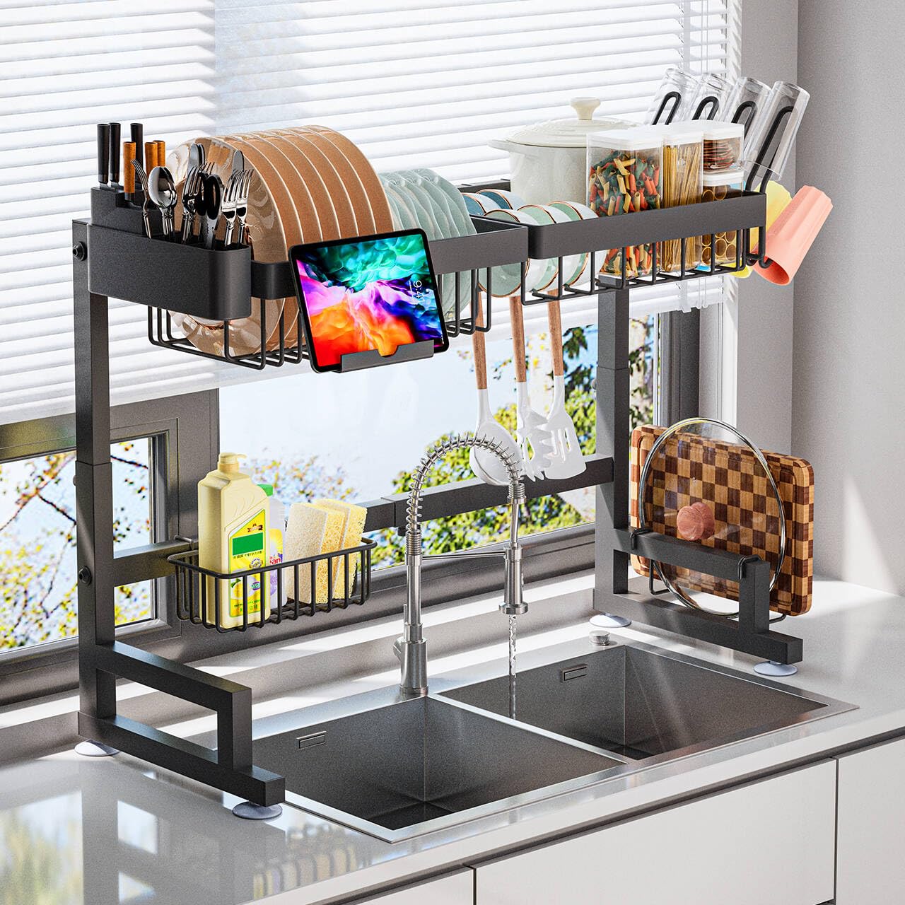 ADBIU 【24.5インチ~32インチのシンクにフィット】 2025年版 シンク上水切りラック (拡張可能な寸法) スナップオンデザイン 2段 大型キッチンディッシュラック ステンレススチール カウンターの整理と収納