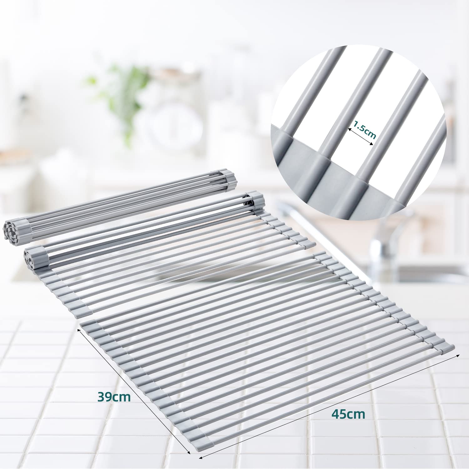 【安定感持ち・耐荷重あり】:45x39cm、重さが約1.1kgで20kgまでの負荷に耐え、従来品より丈夫でシンク上に食器・お鍋・お皿などの調理器具を置いても変形しにくく、安定感のある作りとなっているシリコン水切り。長さは、手動計測のため0.3cmほど異なる場合があります。