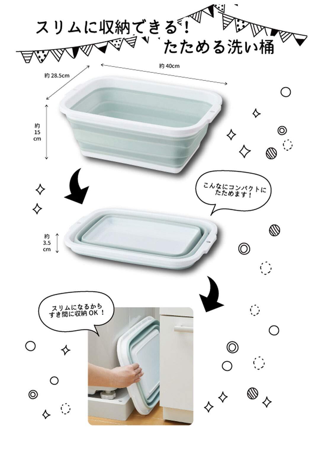 容量たっぷり8.5L(満水時)。使わない時はコンパクトに折りたためる洗い桶。