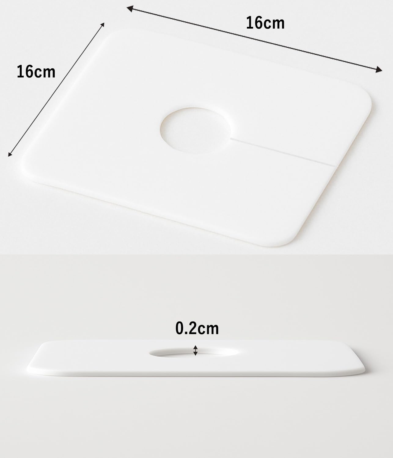 サイズ・適合性:外寸約16×16×0.2cm、中央穴径3.5cm。シリコーン素材なのでハサミでカットしやすく、排水口周りのサイズや形状に合わせて調整して使えます。