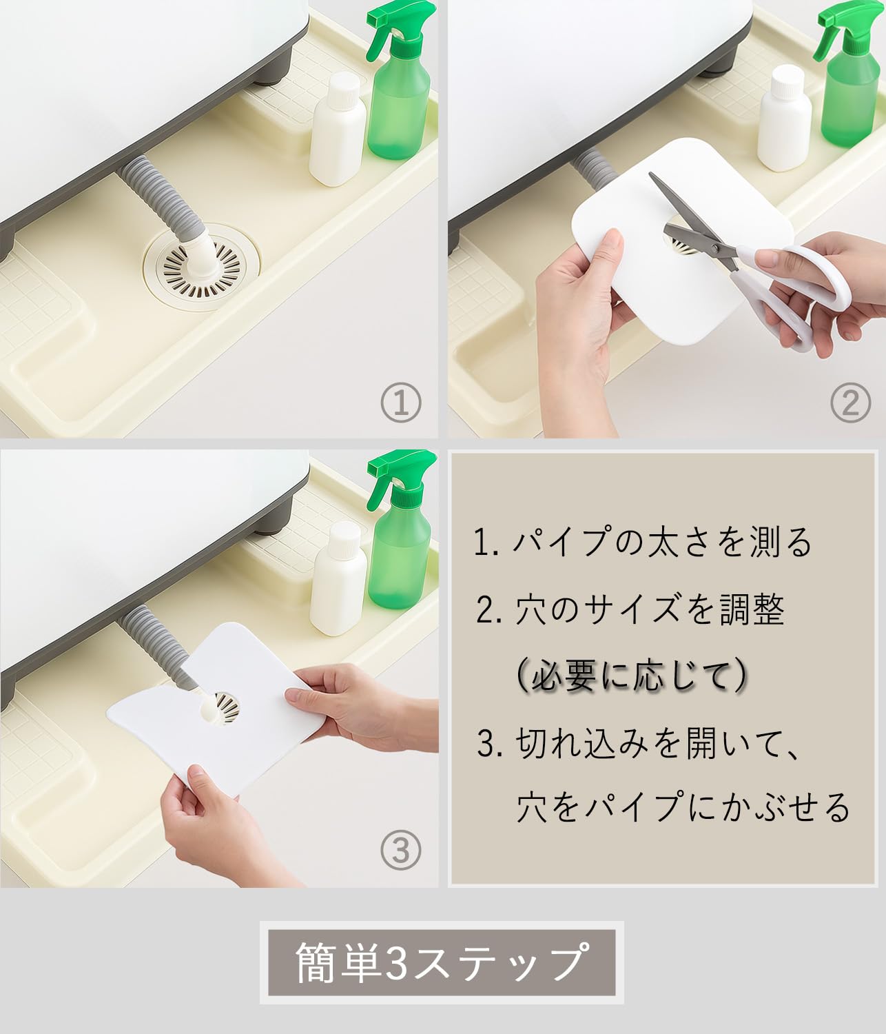 切れ込み付きで簡単装着:本体には切れ込みが入っており、設置時に開いて中央穴を排水トラップの中心部に合わせるだけ。排水管末端と排水トラップの接続部をしっかり囲んでカバーする構造で、工具不要、誰でも手軽に取り付け可能です。