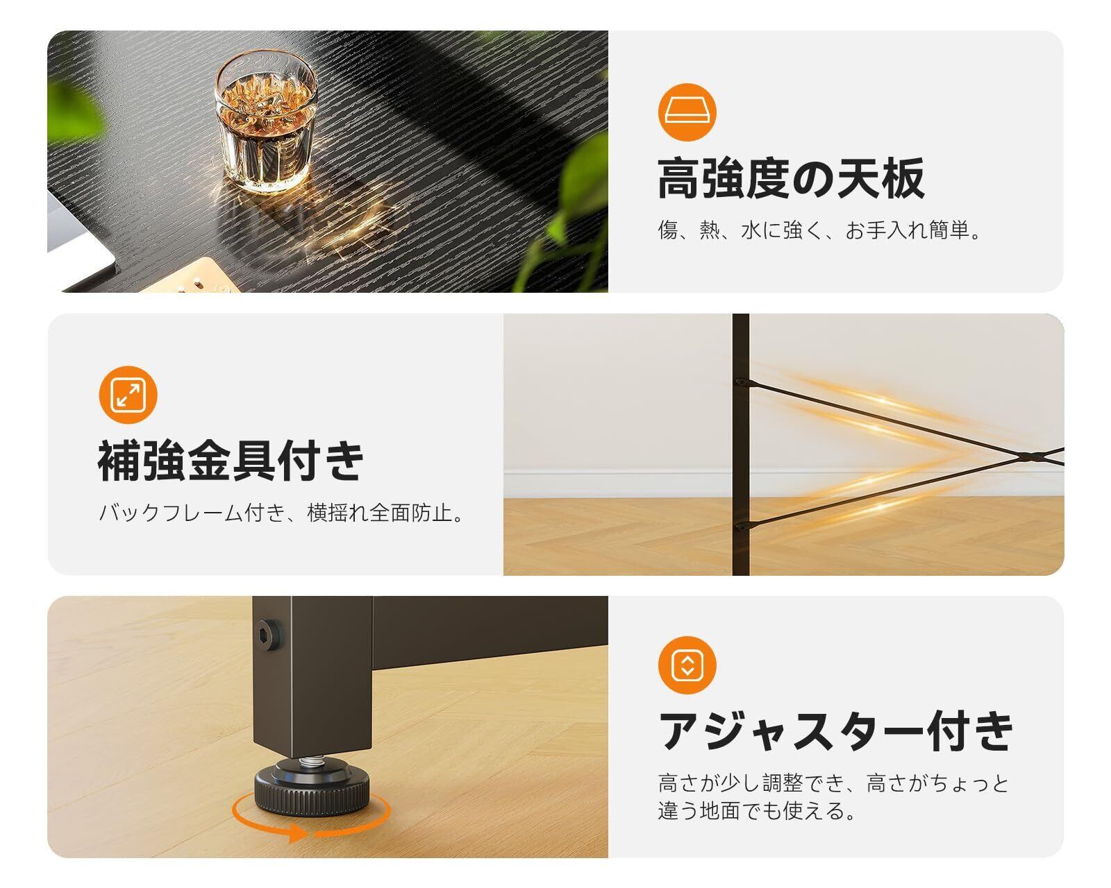 【頑丈設計・耐久性高い】デスクの天板耐荷重は50kg、パソコンや周辺機器を安心に設置できます。高強度のメラミン化粧板を採用し、汚れ、キズや熱・水分に強く、長持ちしやすいpcデスクです。天板裏の補強パイプ・横揺れを防ぐ補強金具・脚先のアジャスター・強度と耐久性の高いスチールフレームで、ガタつきのないしっかりした使用感を実現しました。