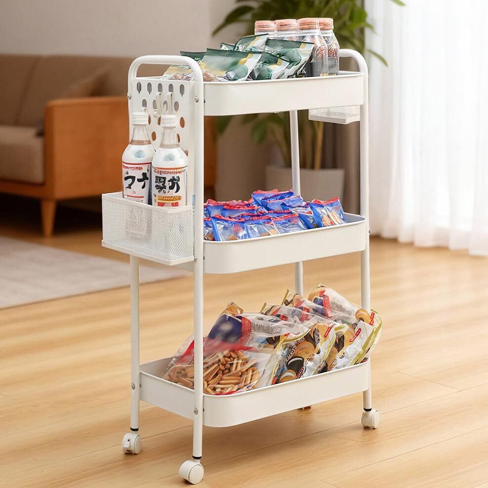【頑丈&大容量】3段スチール構造で1段あたり約15kg耐荷重、食材・日用品・玩具など大量収納可能。 キッチン・リビング・子供部屋など、シーンを問わずたっぷり使える安心設計。