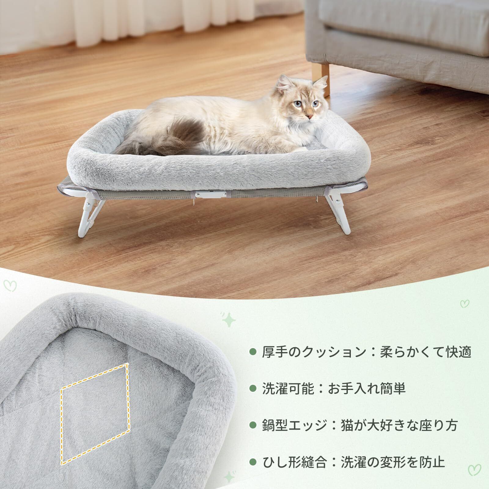 【快適な寝心地】ふわふわなクッションがある程度で体を包み込むような安心感をニャンコに与え。フランネル素材で冬には暖かい、夏には冷房対策になります。1年間快適に過ごせます。床から10cm離れて、虫やほこりの対策になります。湿気や寒気の溜まりの恐れもありません。