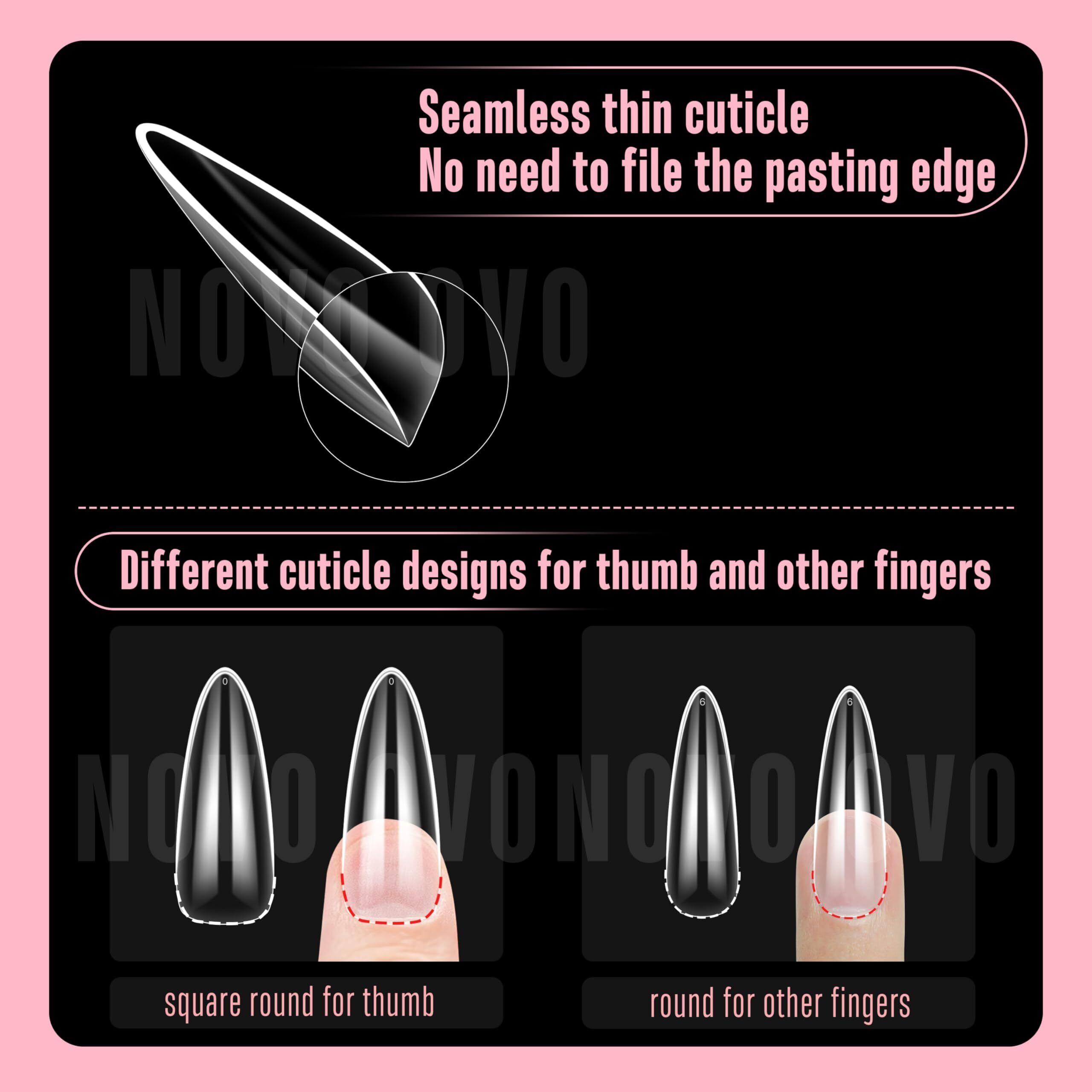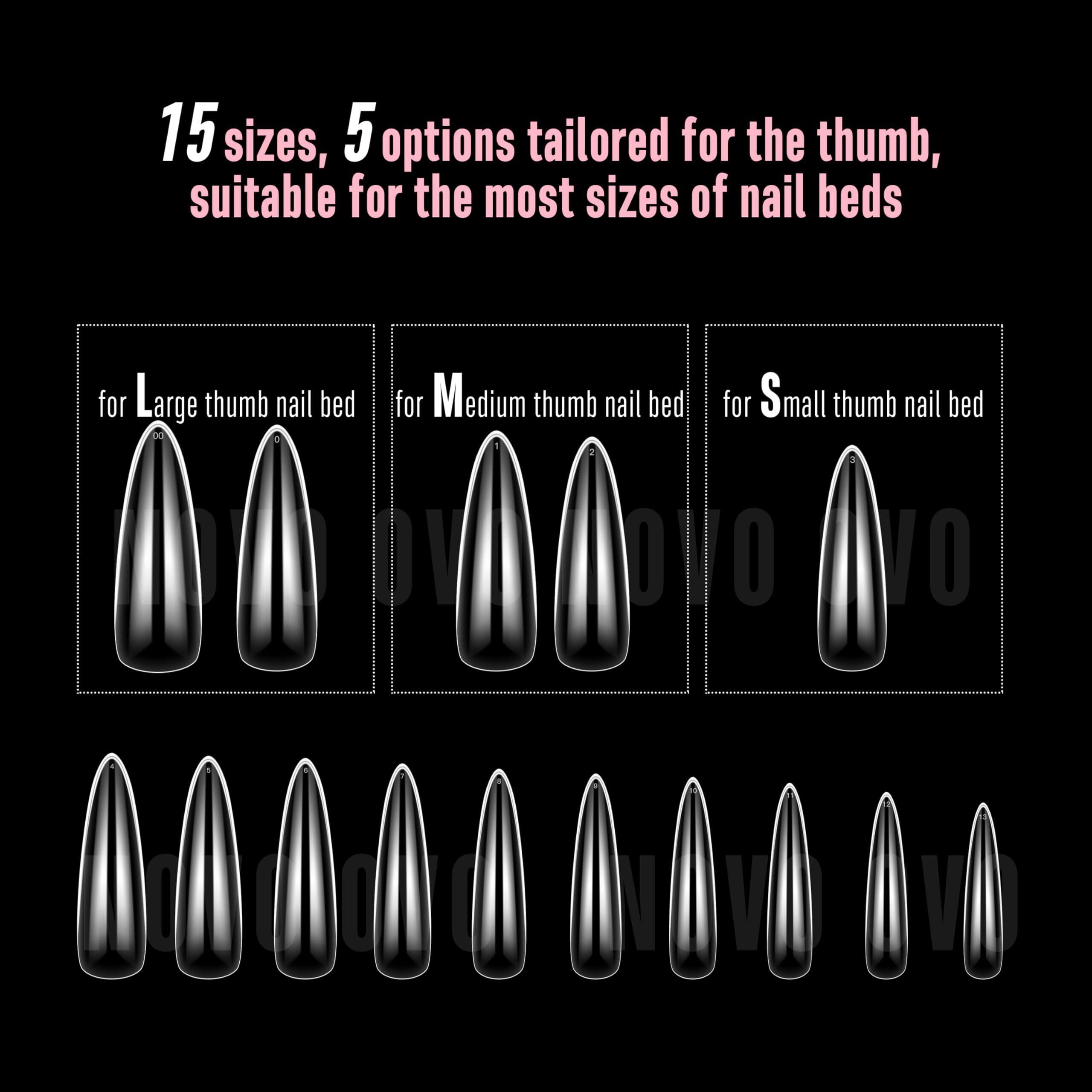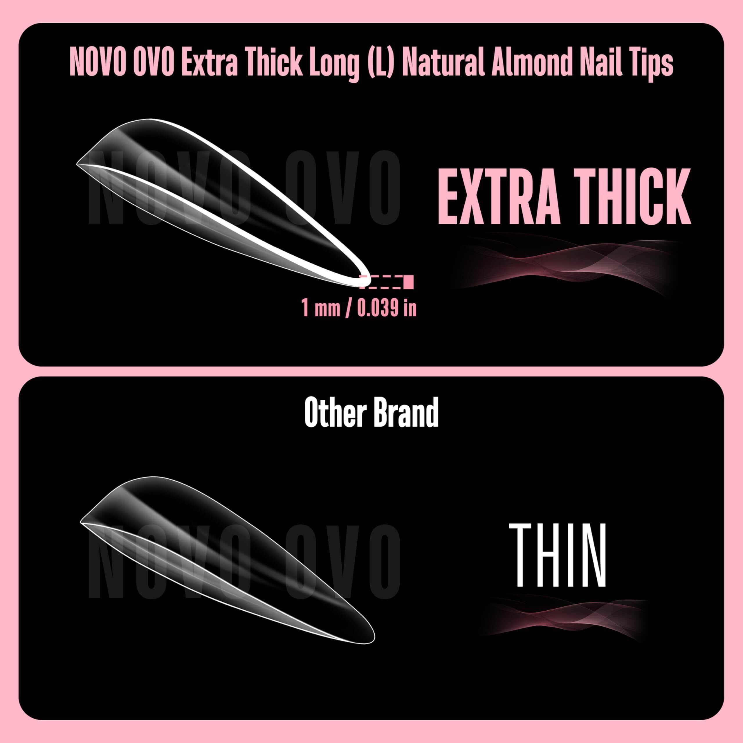 NOVO OVO Long Almond Nail Tips NATURAL (Not SCULPTED) for Flat Nail Beds フラットな爪床用のナチュラルロングアーモンドネイルチップ(彫刻なし)極厚L字型つけ爪、プレスオン、フルカバーソフトジェルつけ爪エクステンション、サロンDIY×15サイズ450個
