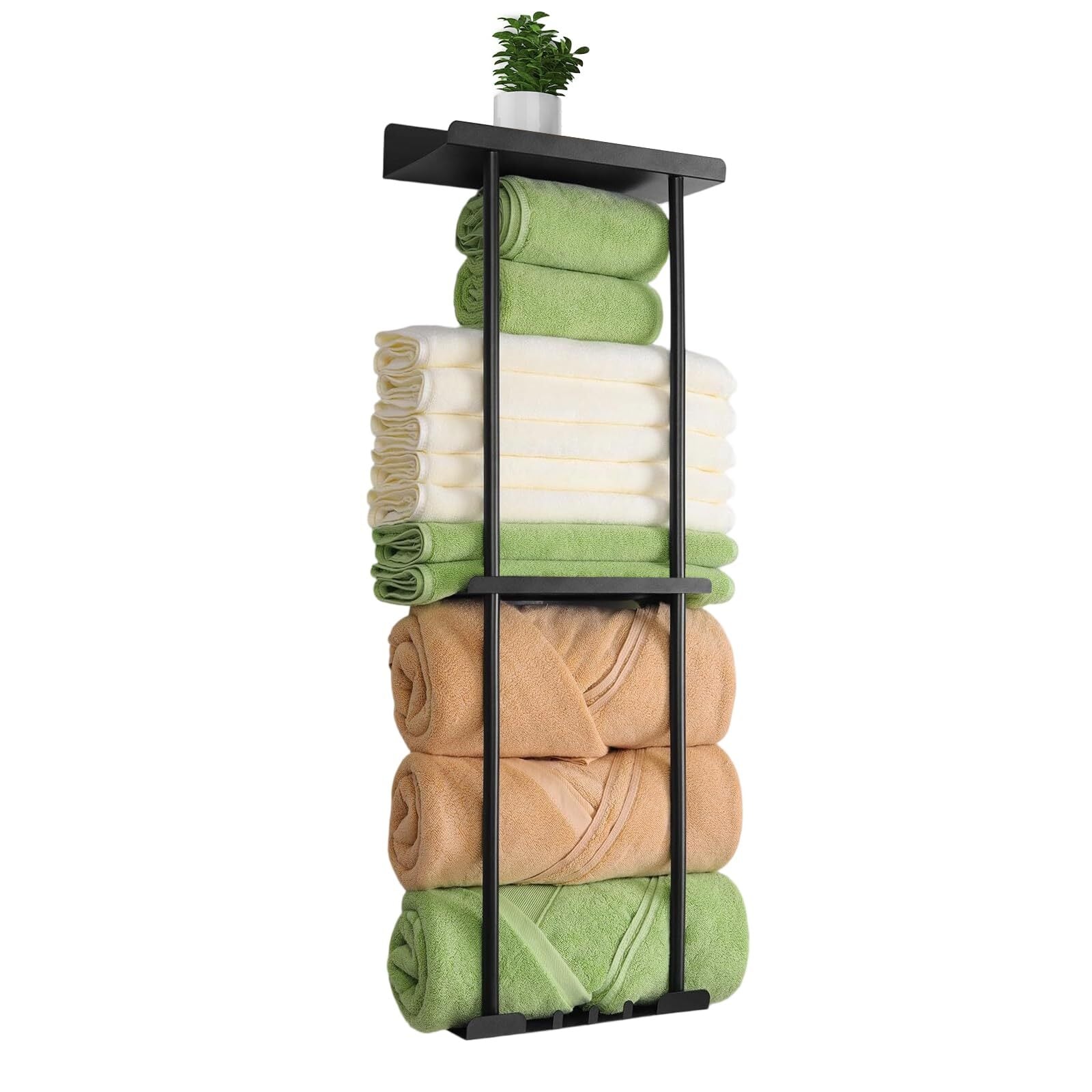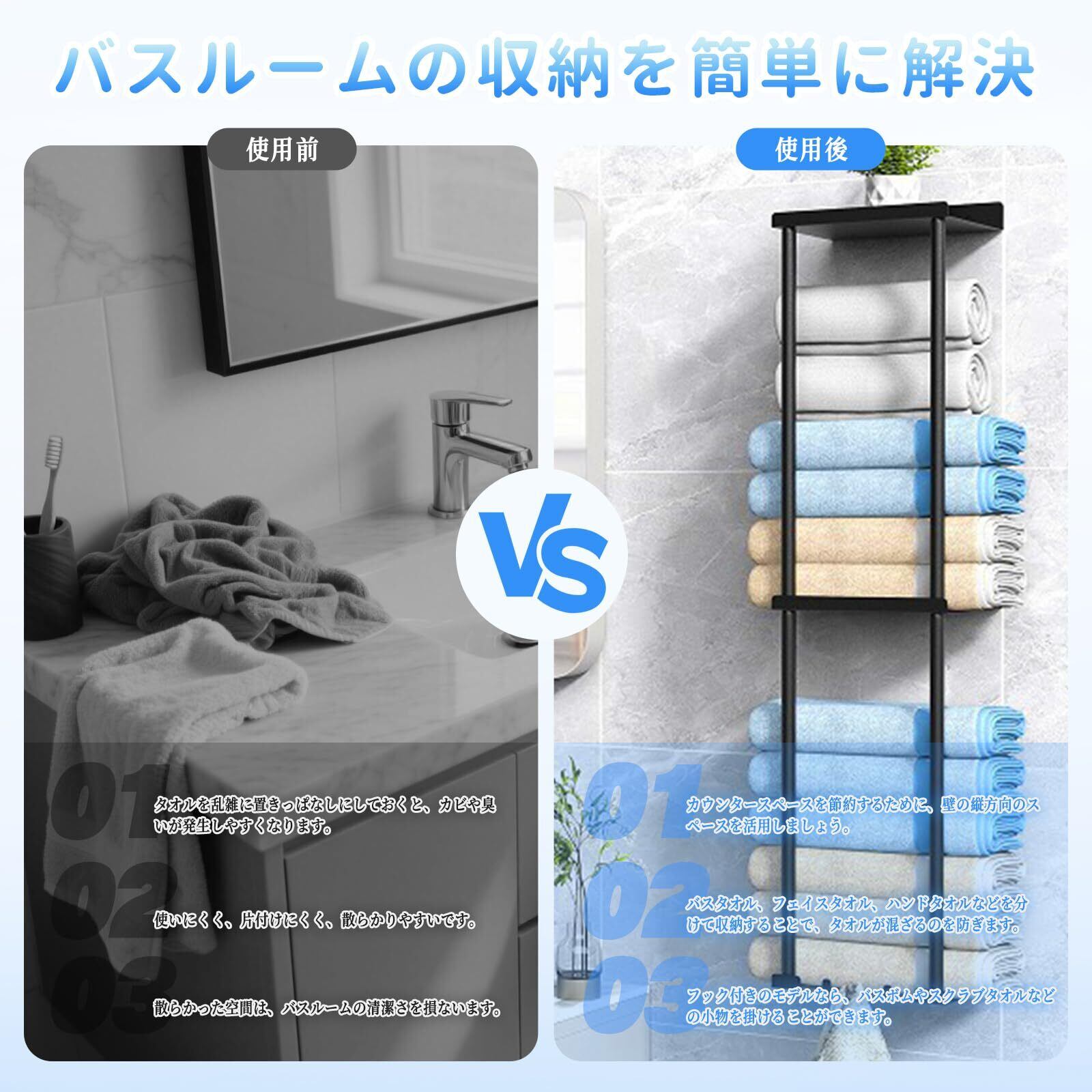 【3段設計で収納力200%UP】従来の単段ラックの3倍、2段ラック比で50%増の収納容量を実現。バスタオル・フェイスタオル・ハンドタオルを階層別に分類収納。わずか14cm×20cmの壁面占有スペースで洗面所/脱衣所の限られた面積を有効活用し、タオル類の散乱を解消します。