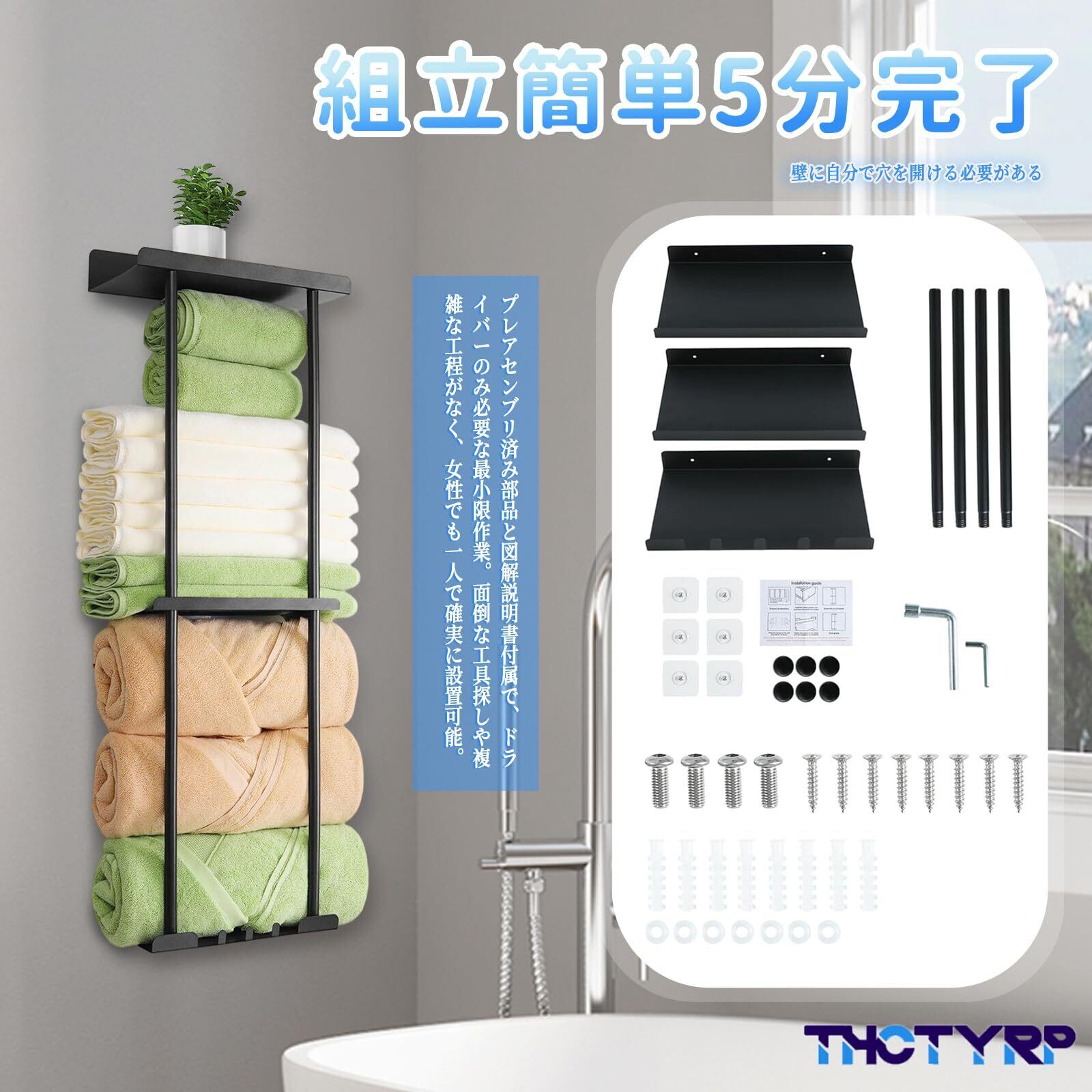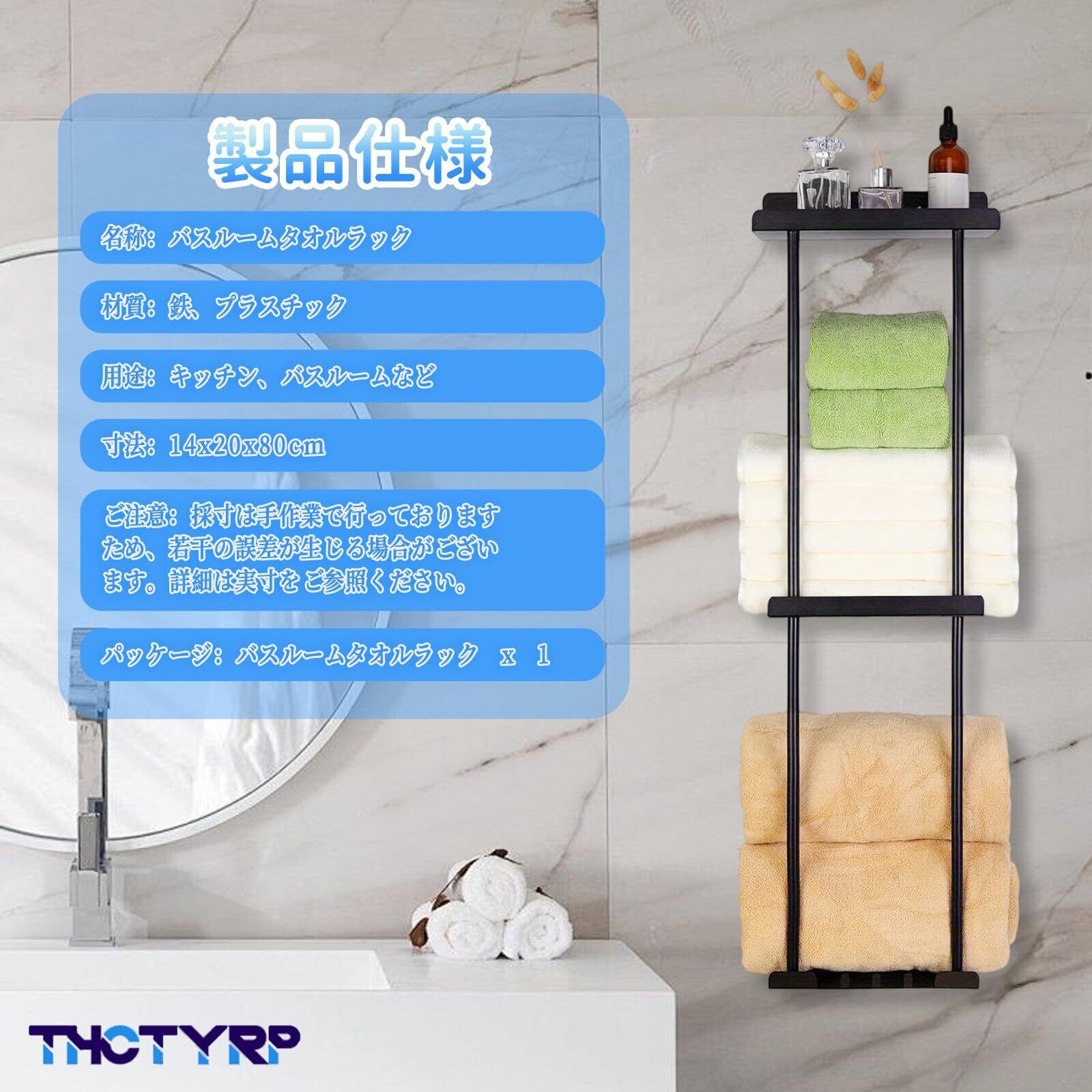 【プロ級耐久性——防錆加工鉄製フレームで長寿命化】 THCTYRPのタオルラックは高強度鉄材を採用し、特殊防錆コーティングで浴室の湿気に耐える。多層研磨処理で滑らかな表面仕上げ、タオル傷みを防止。強力な耐荷重性で厚手バスタオルも安心収納。洗面所・脱衣場の過酷環境でも変形・劣化しません。