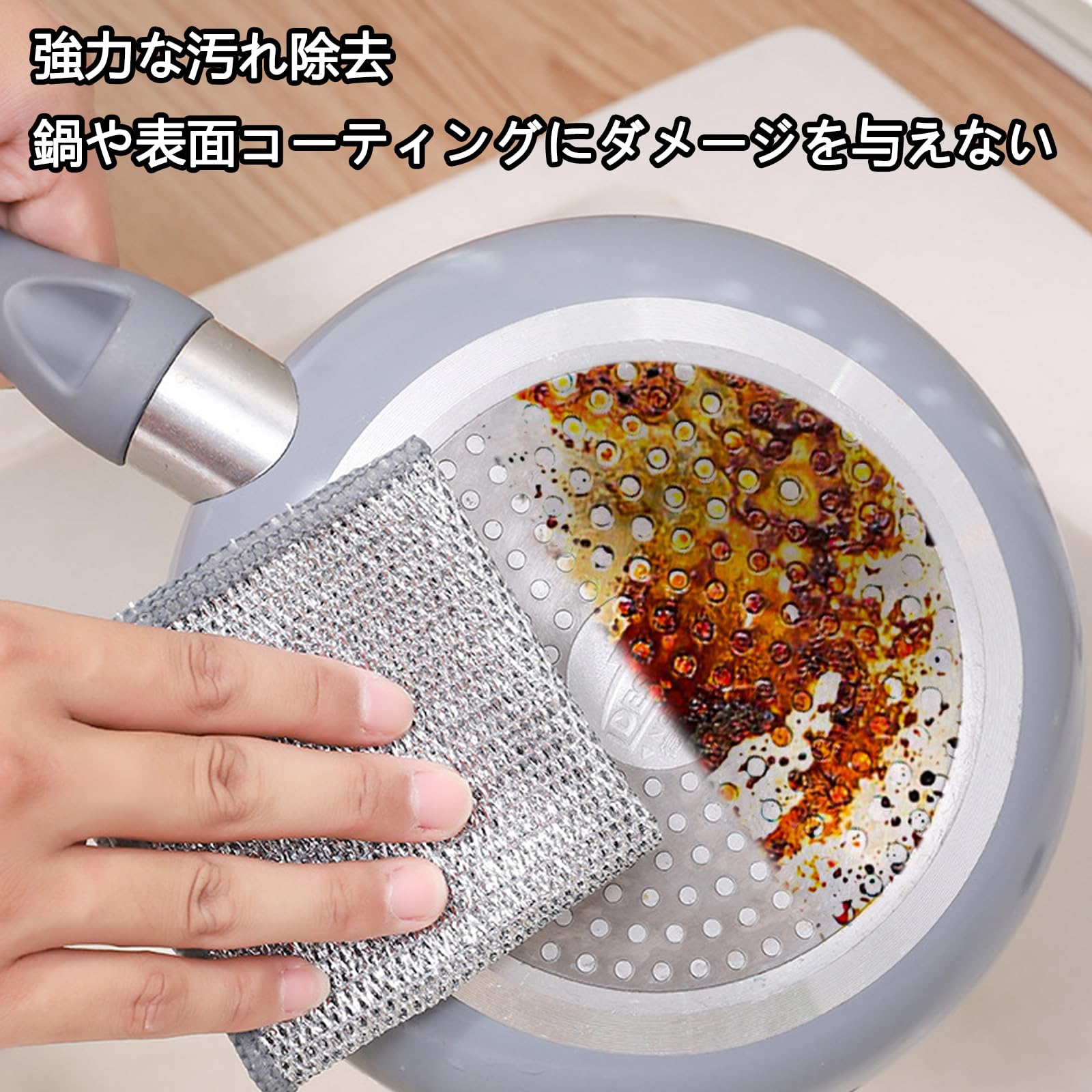 【材質】高密度金属銀糸と環境保護繊維の混紡技術を用いて製造し、隙間に深く入り込んで油汚れ、水垢、焦げなどの頑固な汚れを簡単に崩壊させる。