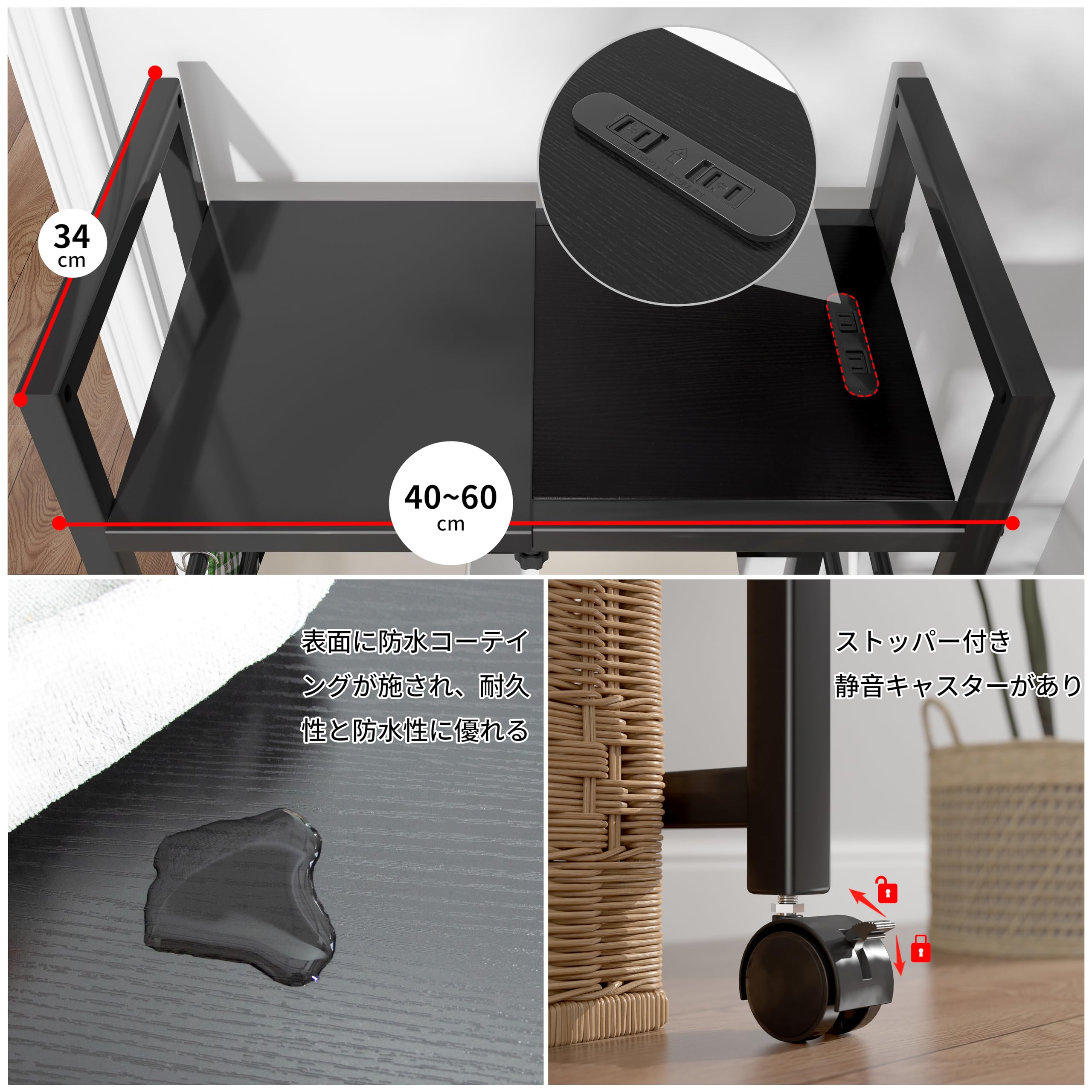 LunarLight ゴミ箱上ラック 幅40-60奥行34高さ90cm 多機能横幅伸縮式 コンセント付き キッチンツールラック レンジ台 オーペンラック ゴミ箱収納 プリント台 可動式棚板多段調整 幅40-60無段階調整可能 Sフック付き 全耐荷重35kg 錆び防止 耐摩耗性 防水性 耐熱性機能(ブラック黒)