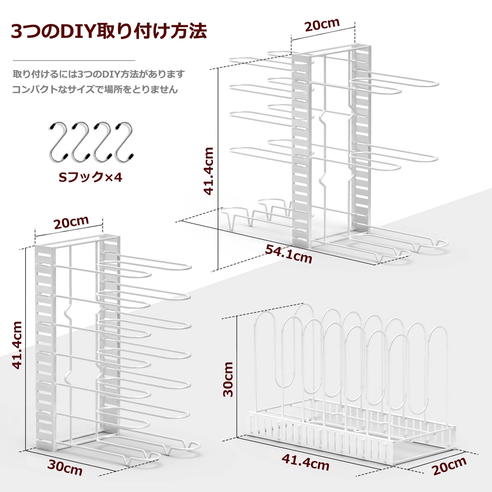 フライパンスタンド (8仕切り フライパンラック フック4個付き) 鍋 フライパン 収納 スタンド 3インストール方法 鍋蓋 縦置 横置 高さ調整可能 省スペース 防錆 耐熱 ホワイト