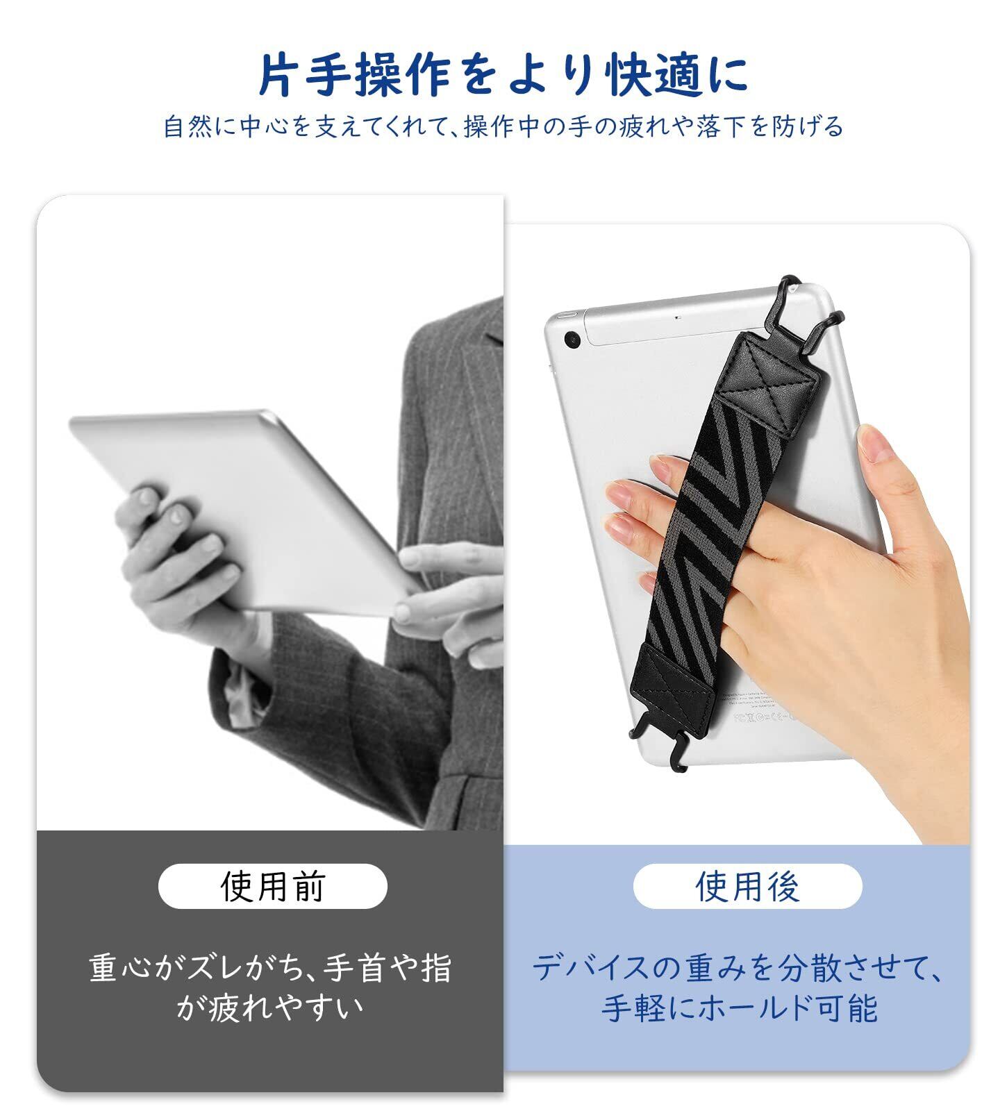 「取り扱い簡単」 端末に引っ掛けて、利き手に関わらず、手を通すだけで全体にホールド感があって、重みを分散させ、同じ端末を今までのない軽く感じさせてくれて、手軽にご利用いただけます。ナナメ対角線方向に使用をおすすめします。