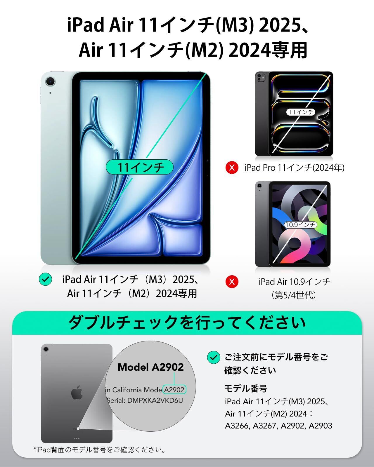【互換性】:iPad Air 11インチ(M3)2025、Air 11インチ(M2)2024専用です。モデル:A3266、A3267、A2902、A2903。他のiPadモデルと互換性がありません。