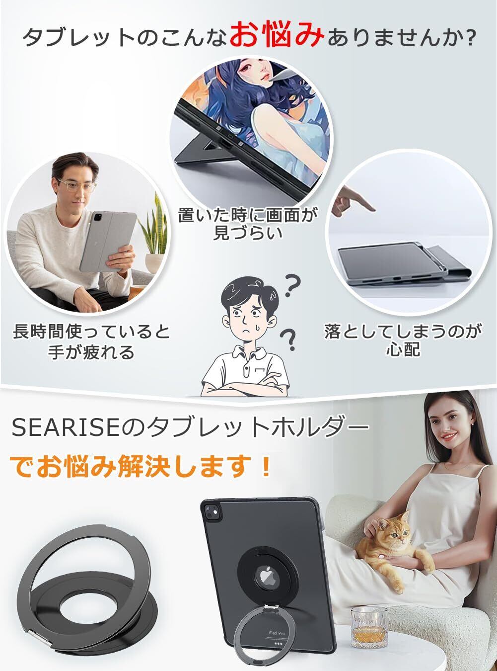 SEARISE タブレットホルダー タブレットスタンド iPadスタンド【軽量&薄いリング型】卓上 横置き 縦置き 持ち運び便利 360度調整可能 マグネット設置可能 折りたたみ式 iPad Pro/Air/mini/Kindle 多機種対応 貼り付け パッド 落下防止(ブラック)