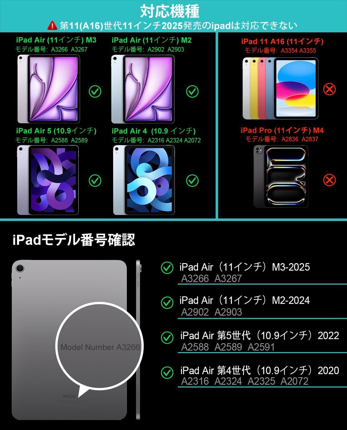【交換性】2025 iPad Air 11インチ(M3) (モデル番号: A3266/A3267)、2024 iPad Air 11インチ(M2) (モデル番号: A2902/A2903)、iPad Air (第5世代) (モデル番号: A2588/A2589/A2591), iPad Air (第4世代) 10.9 インチ(モデル番号: A2316/A2324/A2325/A2072). 他のiPadモデルには非対応です。iPad Air本体裏面にアルファベットの「A」から始まる5桁の英数字がモデル番号で購入前をご確認ください。