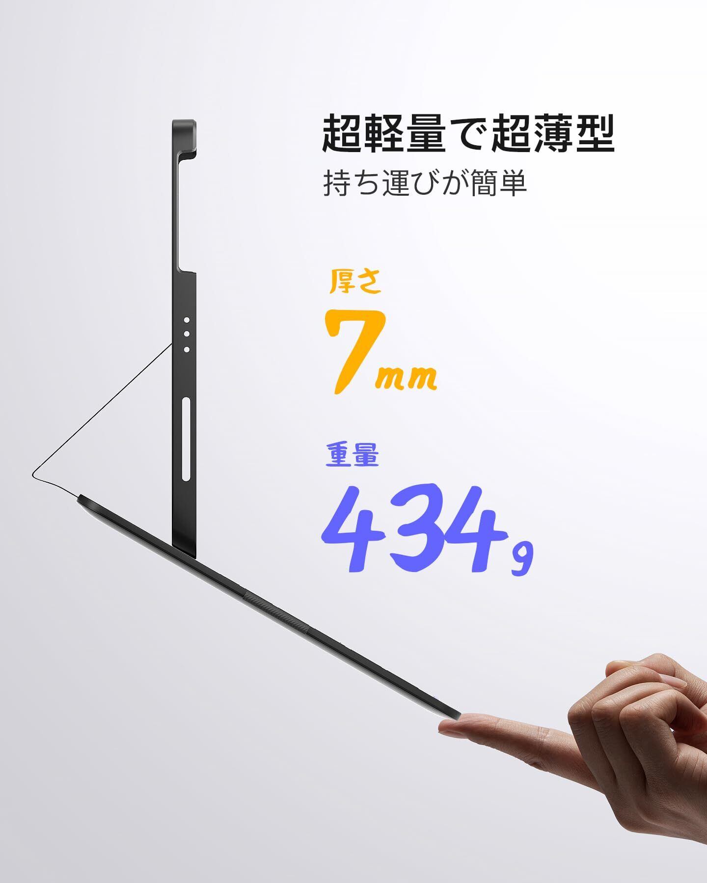 超薄型で超軽量:キーボードの厚さは0.7cmで、カバーで覆われているときが1.5cmです。全体の重量は434gで、類似製品の90%より軽量。より便利に持ち歩くための軽量設計です