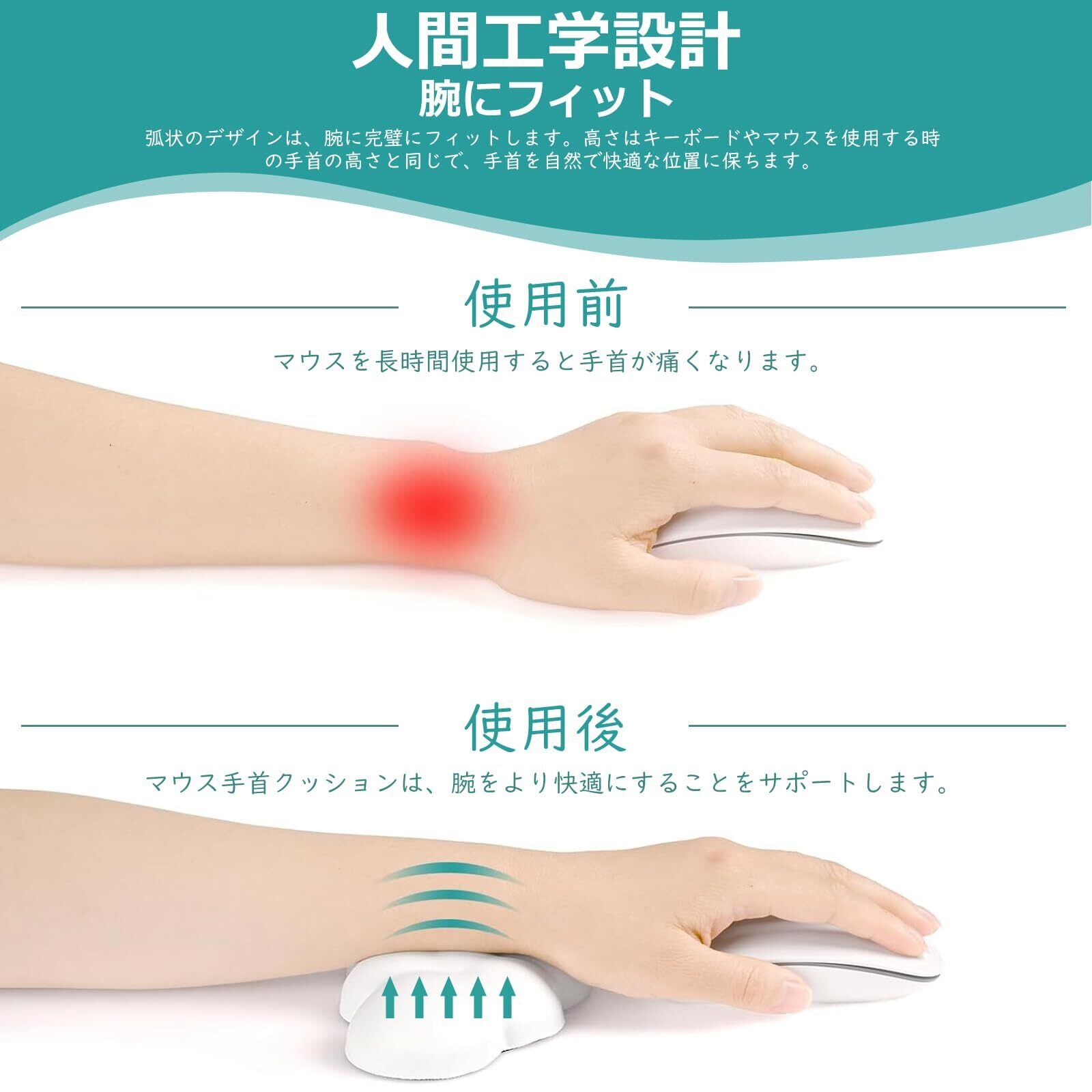 【腕にフィット、人間工学設計】マウス手首クッションの弧状のデザインは、腕に完璧にフィットします。マウス手首クッションの高さは、キーボードやマウスを使用するときの手首の高さと同じで、手首を自然で快適な位置に保ちます。マウス手首クッションは机と手首の接触圧力を減らし、マウスを操作するときの手首の疲労を軽減します。