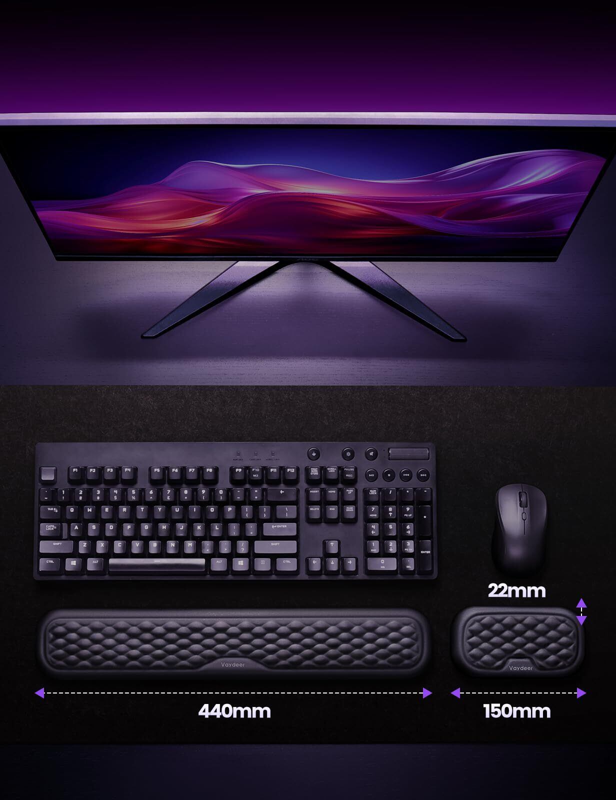 VAYDEER リストレスト キーボード 手首置き パームレスト 低反発 クッション 人間工学デザイン コンピュータ/タイピング/オフィス/仕事/家庭/ゲーム用(ブラック 44cm+15cm)