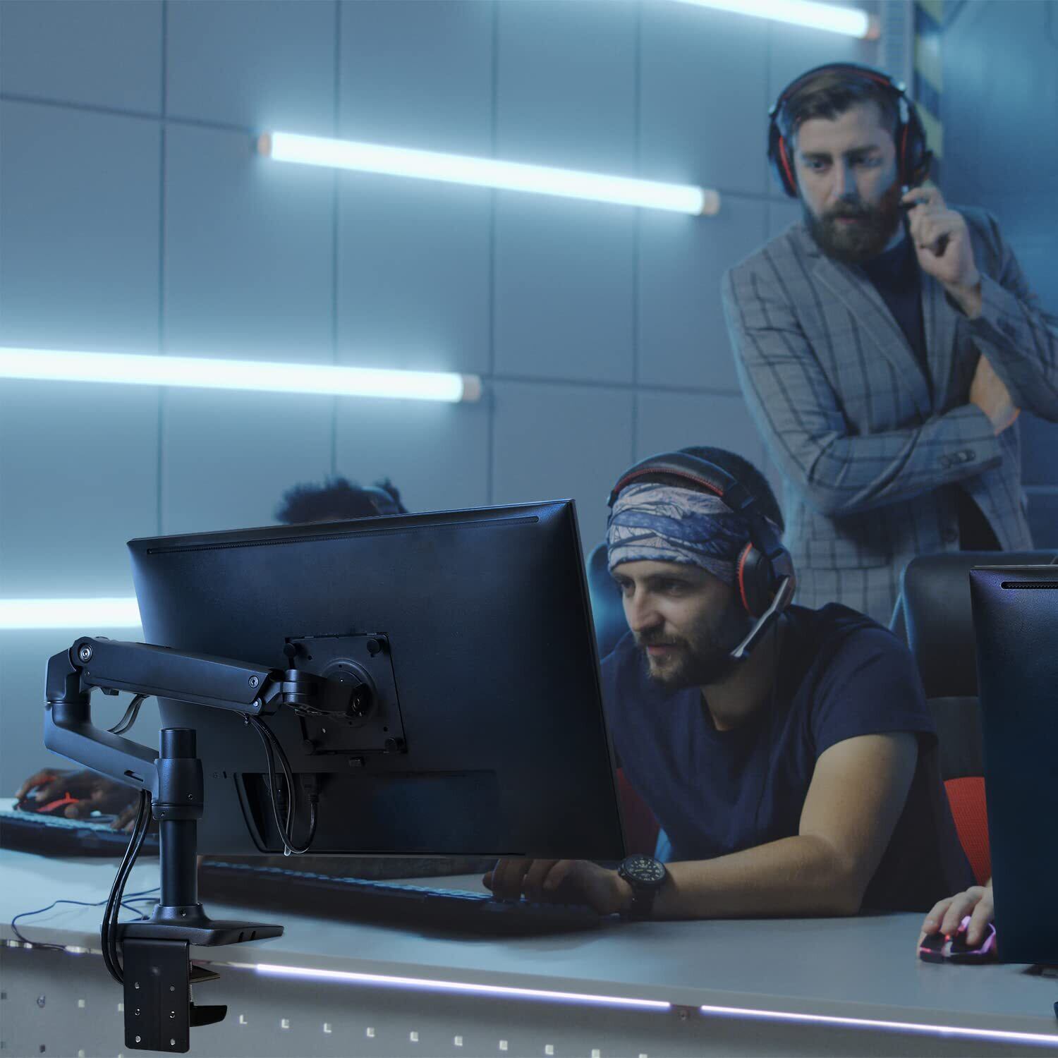 可動範囲が広い多用途向け万能モニターアームです。使用しないときはコンパクトに折りたため、作業スペースを広く使えます。