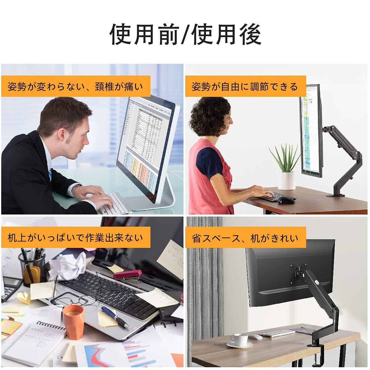 【猫背対策】ガススプリング式でスムーズな高さを調節できます。モニターアームはいろんな角度を調整できて自由度は高いです。そして、立てで仕事もできます。角度や距離などが自分に合わせるにして、背や首の疲れをリラックスします。