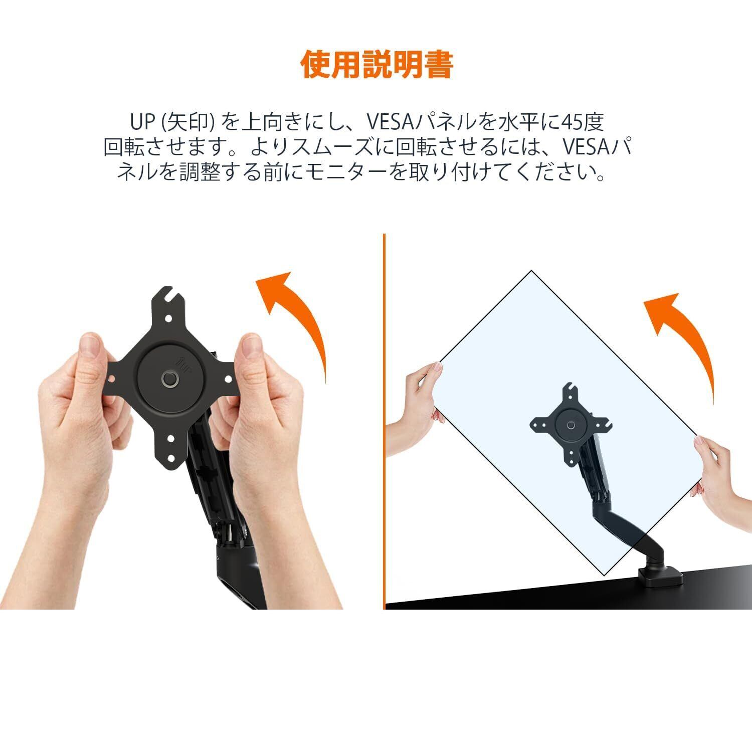 調節可能な設計:: 75x75mmまたは100x100mmのVESA規格対応。傾斜-90°~+85°、回転(スイベル)90°、回転(ローテーション)360°。長さ52cm/高さ46cmまで延長可能。