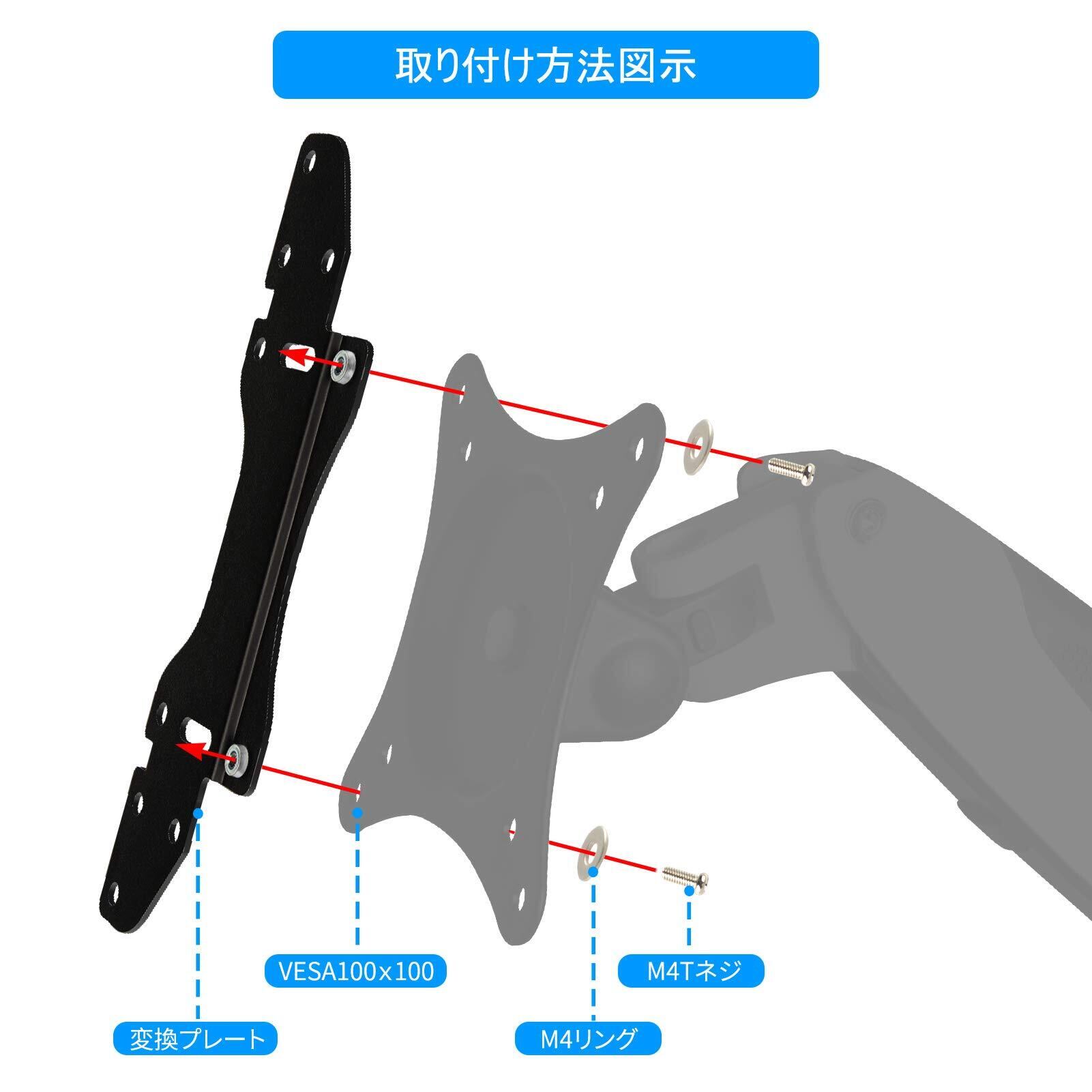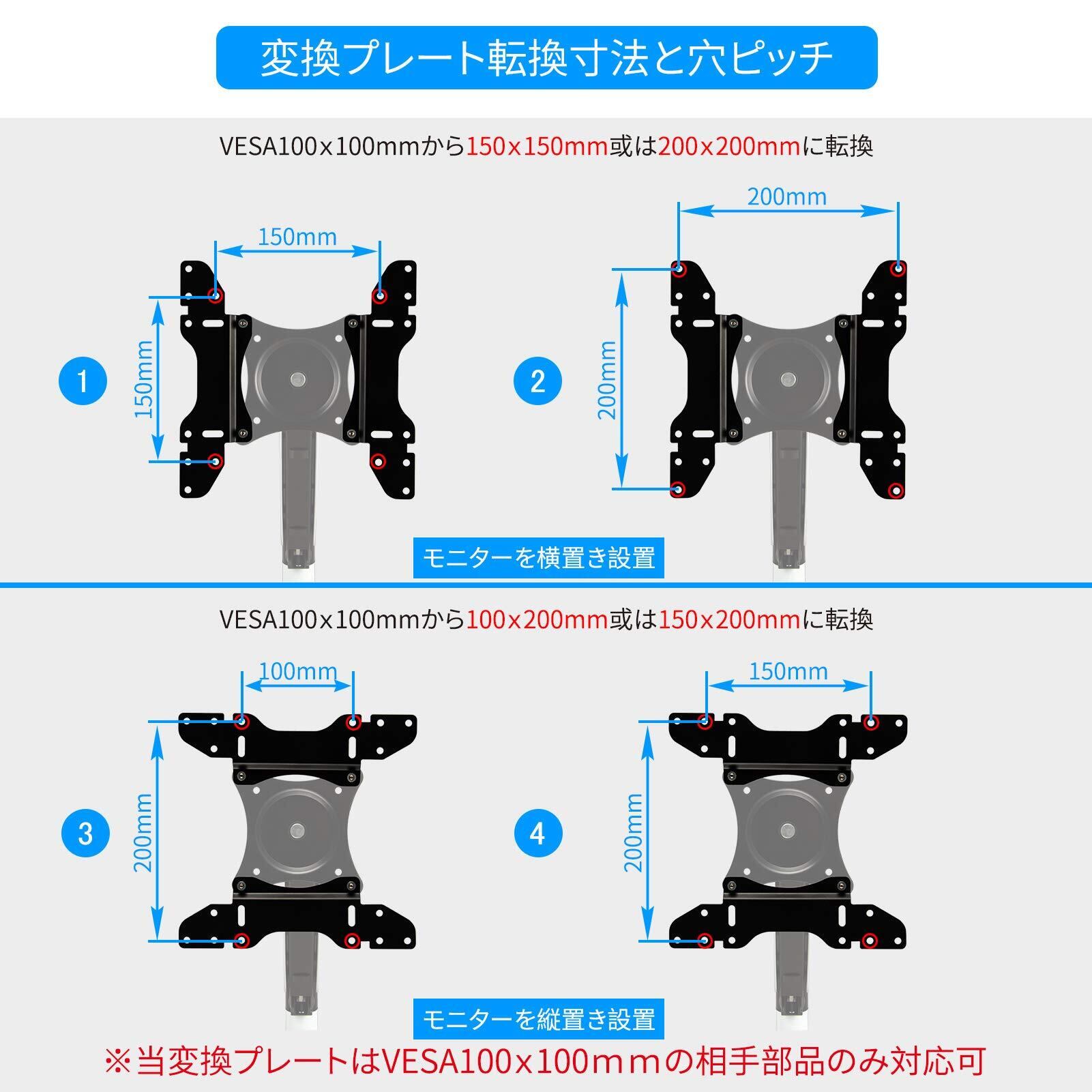VESA変換プレート規格100X100mmから200X200mm、100X100mmから100X200mm、100X100mmから150X150mm、100X100mmから150X200mmに転換できます。モニターアーム 壁掛け金具に適します。