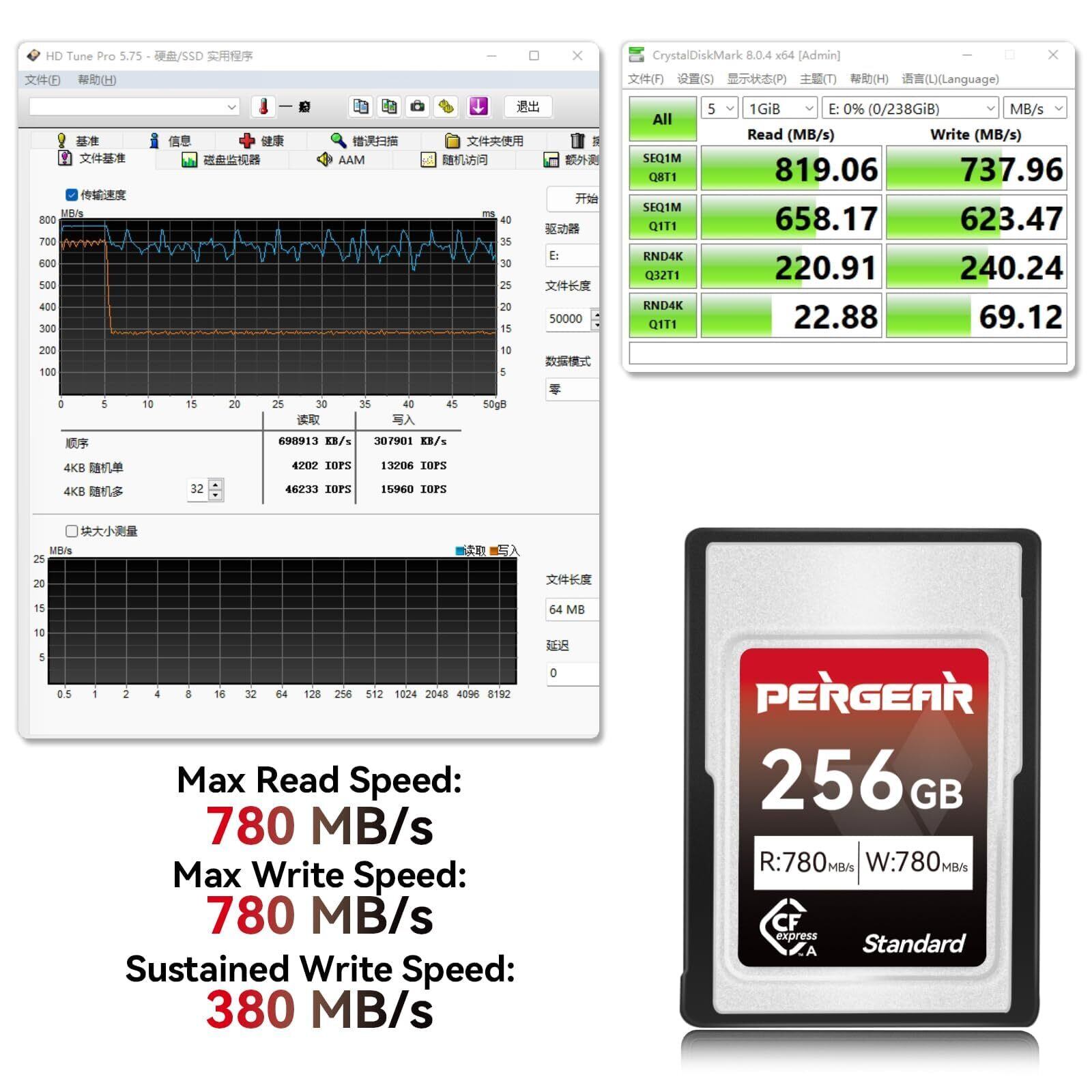 安定したパフォーマンス: Pergear 256GB cfexpress タイプAカードは、最大読み取り速度780MB/秒、最大書き込み速度780MB/秒、持続書き込み速度380MB/秒を実現します。ご注意:速度は内部テストに基づき、実際の転送速度および容量は、ホストデバイス、ファイル属性、システムハードウェアおよびその他の要因によって異なる場合があります。