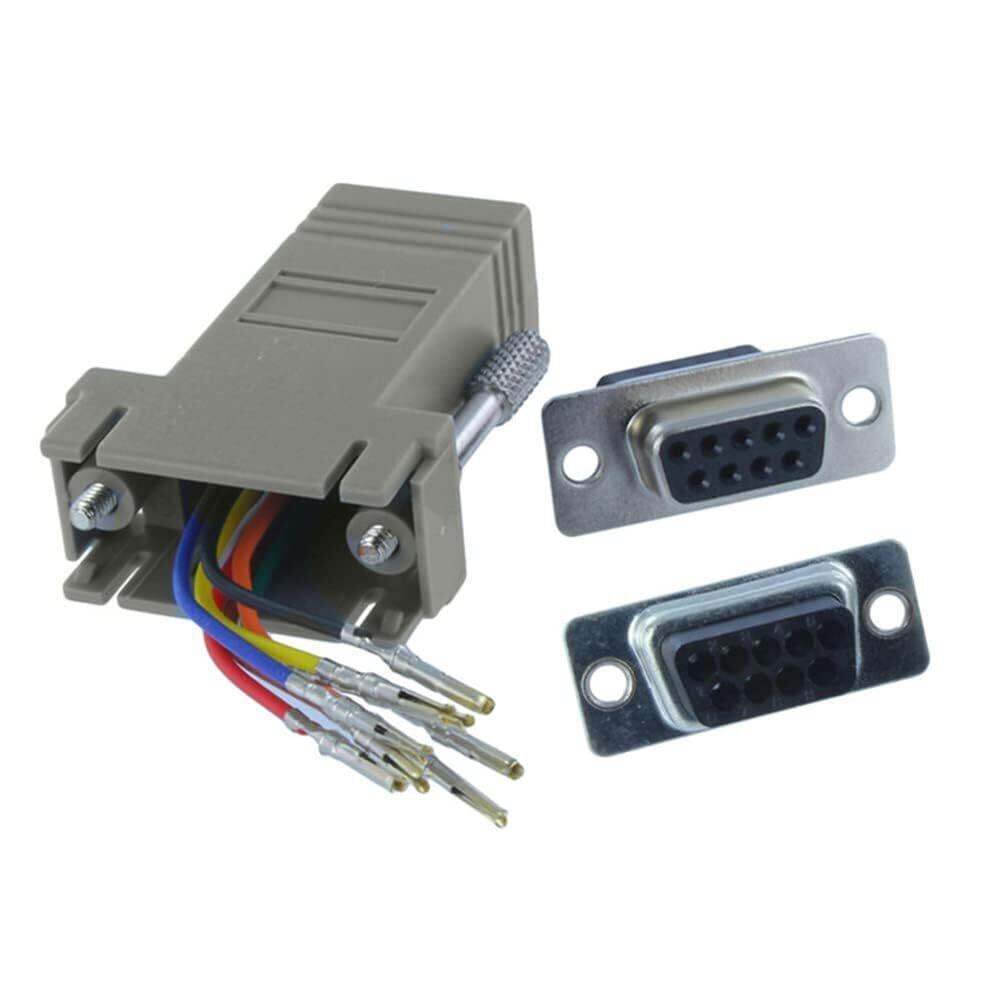 DB9メスコネクタとRJ45メスコネクタがついたモジュラーアダプタ。RS232、RS422、RS485のモジュラー接続で、DB9オス接続をRJ45メス接続に変換します。シリアルピン配列のカスタム構成が可能になります。