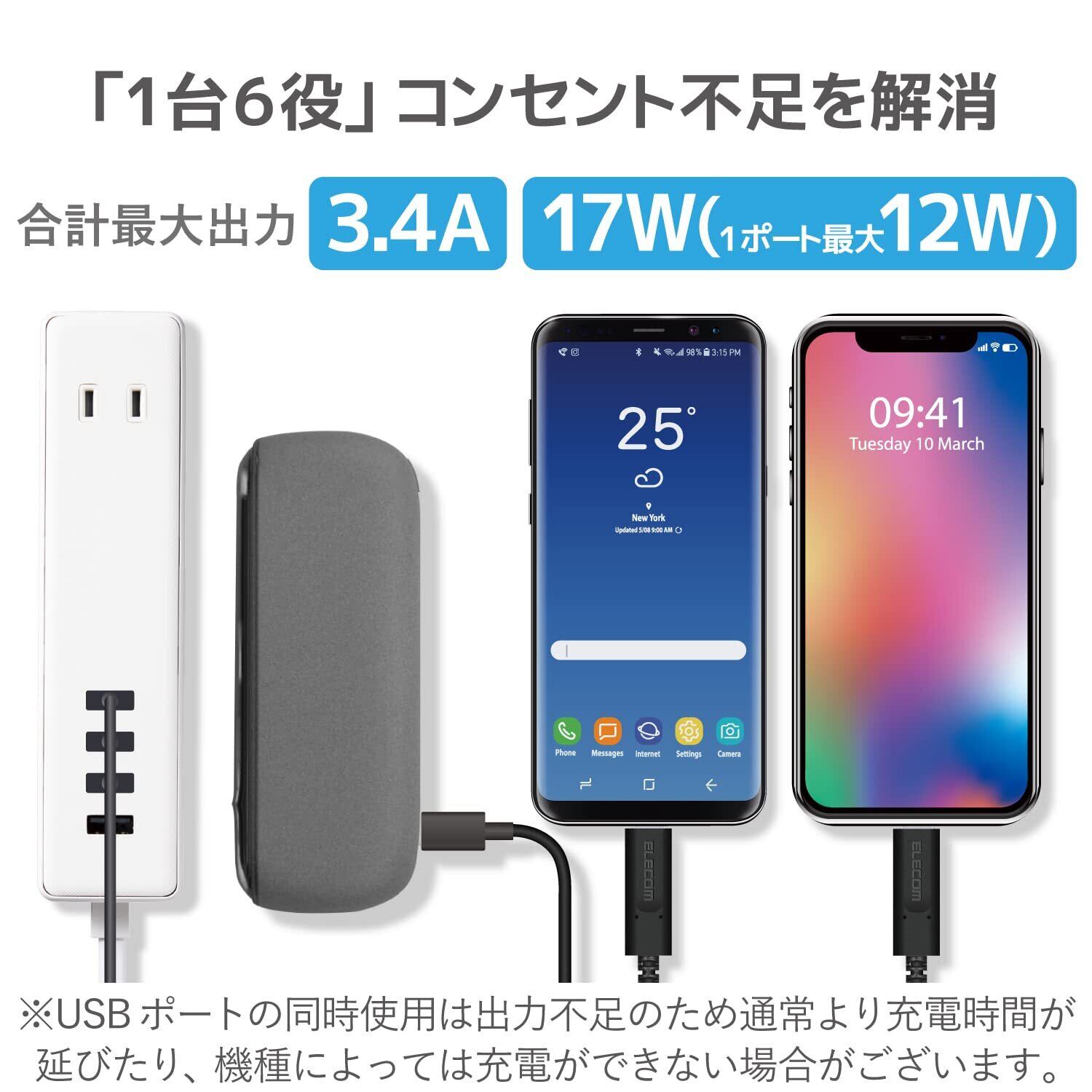 エレコム 電源タップ USBタップ 3.4A (USBポート×4 コンセント×2) 1.5m ホワイト ECT-0415WH