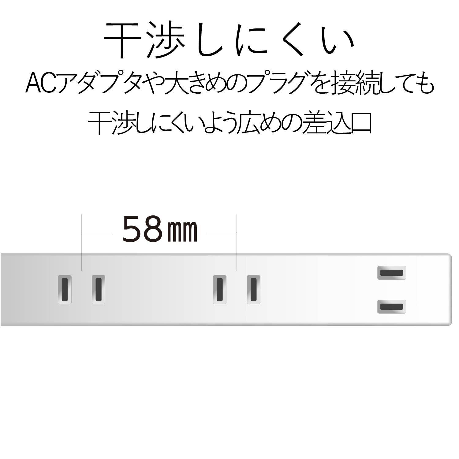 ■タップの差込口の間隔が約58mmと通常のタップと比較して広く、ACアダプタもすっきり接続可能です。