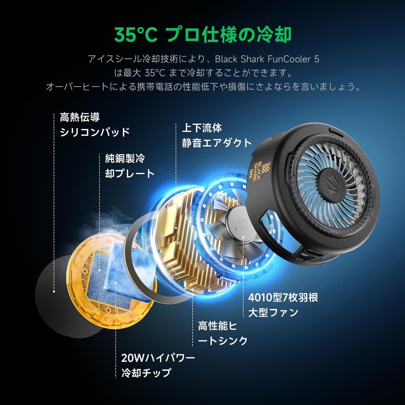 Black Shark FunCooler 5 磁気式 スマホ 冷却 散熱器、RGB冷却ファン 取り外し可能なグリップ付きの携帯電話ラジエーター、スマホクーラー iPhone Magneticシリーズ/Android 用のポータブル、ゲーム、ライブ配信、撮影に対応(黒)