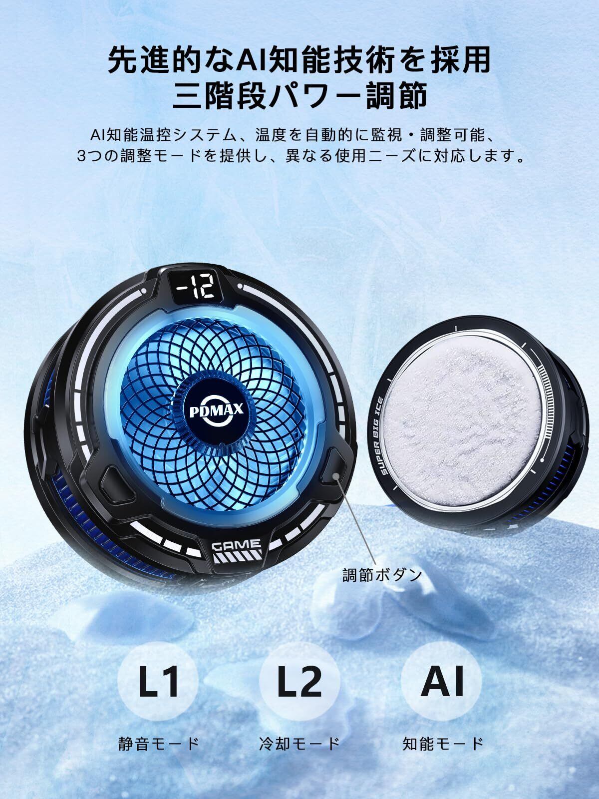 【AI知能温控システムで最適冷却】 温度が見える! LED表示でスマホ温度が一目瞭然!賢いAIが自動調整! デバイス温度をリアルタイム監視し、最適な冷却モードに自動切替え。3段階モードでどんな使用シーンもカバー。手動制御も可能! AIオフにして、お好みの冷却方法を選択可。