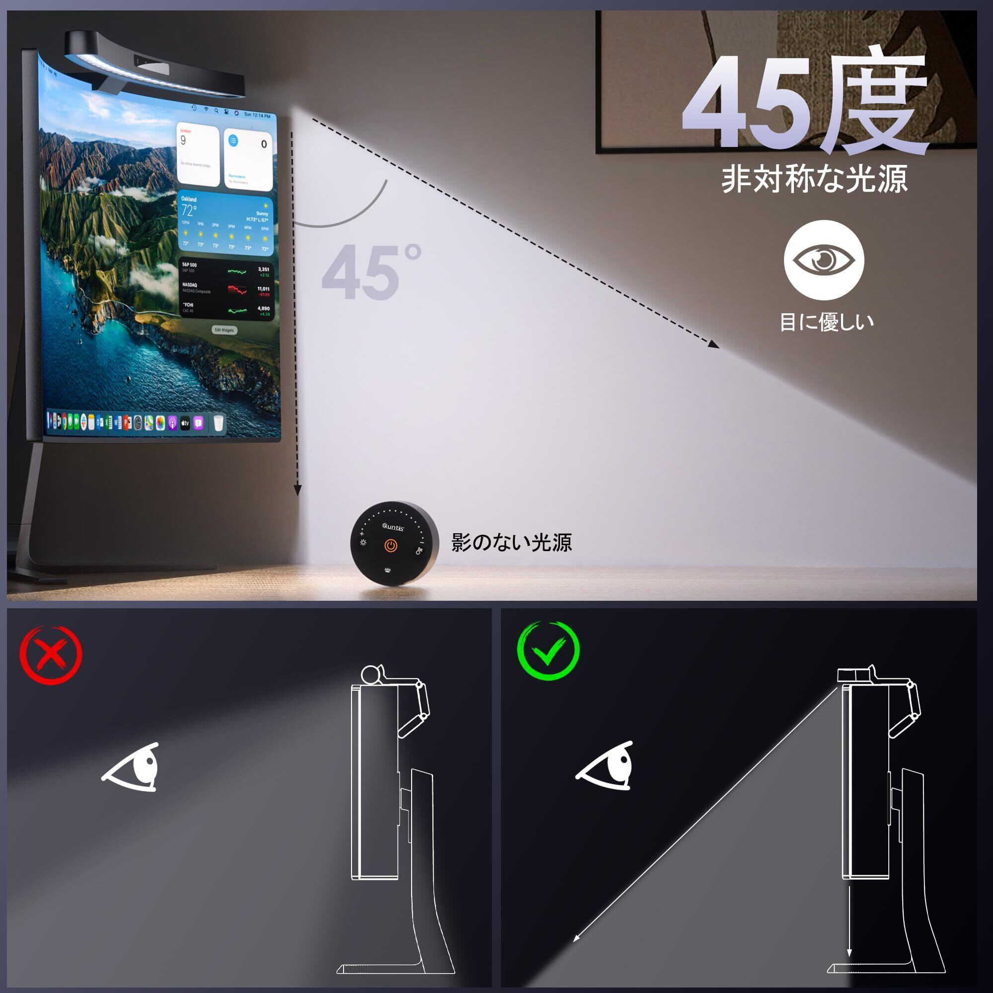 【反射光のない画面で集中力アップと目に優しい】 Quntisモニターライトの45°非対称光学設計により、画面の反射光を排除し、デスクトップとキーボードだけを照らして集中力を高め、目の疲れを軽減します。また、IEC62778規格のブルーライトカット認証を取得したモニターライトは、目を保護します。デスクライト上のカメラベースがデスクのスペースを節約し、カメラを完璧に収めます。