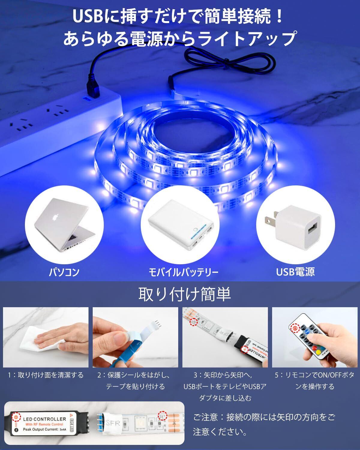 【幅広い適用】テレビ・家具・パソコン・床・廊下・キッチン・ベッドルーム・バーカウンター・クローゼットなどの装飾に最適で、天井、階段、玄関、バー、レストラン、パーティー、クリスマス、結婚式、展覧会の装飾などにも幅広く活用されます。華やかな雰囲気を作り出せるため、イルミネーション用のライトとして使うのもおすすめです。はさみ等で簡単に切断できるので、取り付けたい場所にあわせて使用できます。