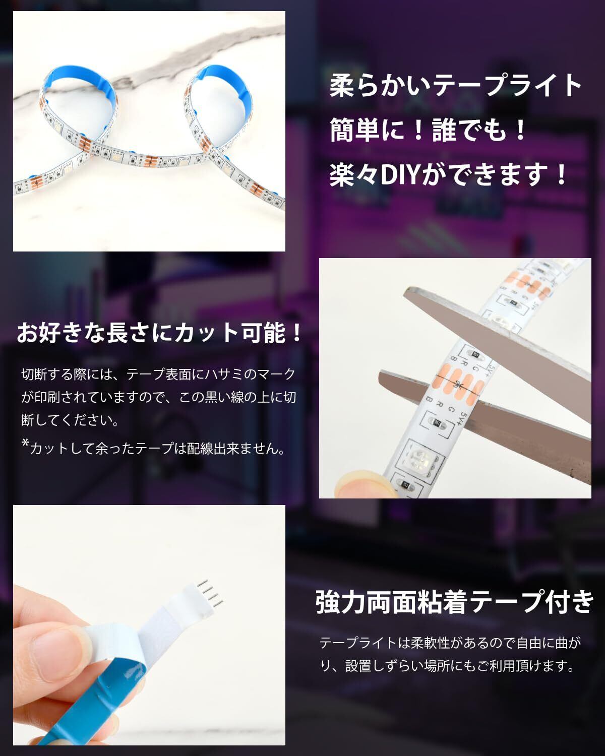 【LEDテープが切断可能】両面テープで簡単に設置できるテープライトです。切る・曲げるなどの加工も自由にでき、細かい演出がしやすいのも嬉しいポイントです。柔軟でDIYできるLED テープの長さは2mですが、お好きな長さにカット可能なので、どんなスペースにも対応できます。