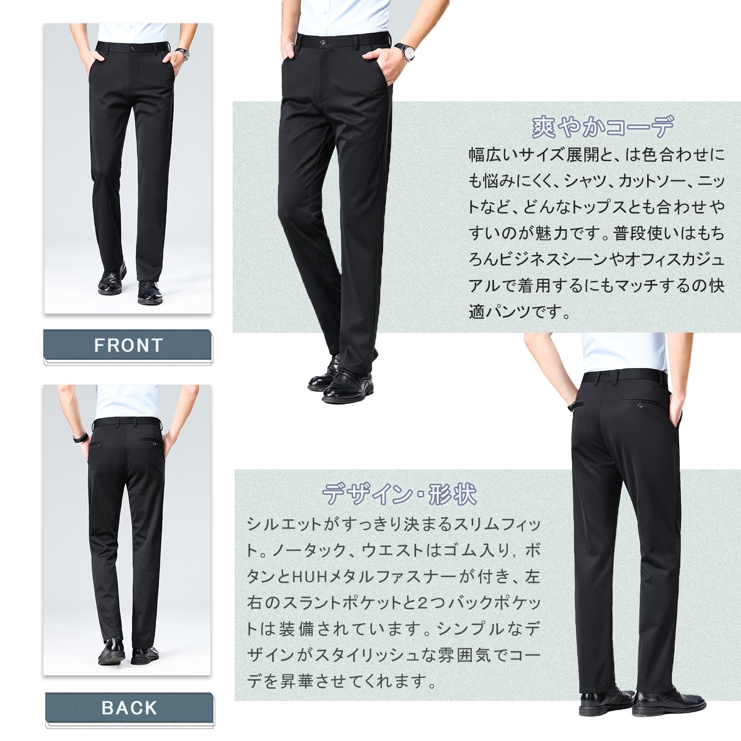 【デザイン・形状】ノータック仕様でもゆとりのあるベーシックシルエット定番人気のビジネススラックスです。幅広いサイズ展開と、ややゆったりしたスリムすぎない着用感が魅力、オフィスのクールビズスタイルに大活躍のアイテム。