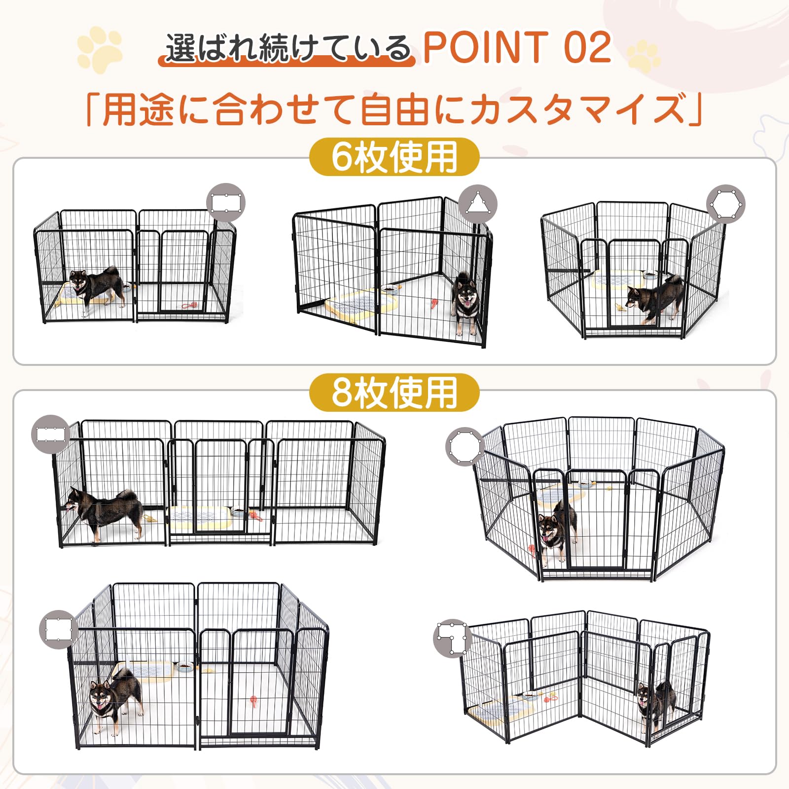 【自由な組み合わせ】パネルの枚数により、フェンスを長方形、正方形、八角形、L字型など、さまざまな形に組み合わせることができます。お家のスペースやペットの状況に合わせて自由に設置できます。8枚セットは2つのフェンスに分けて、2匹のペットを分けることも可能です。