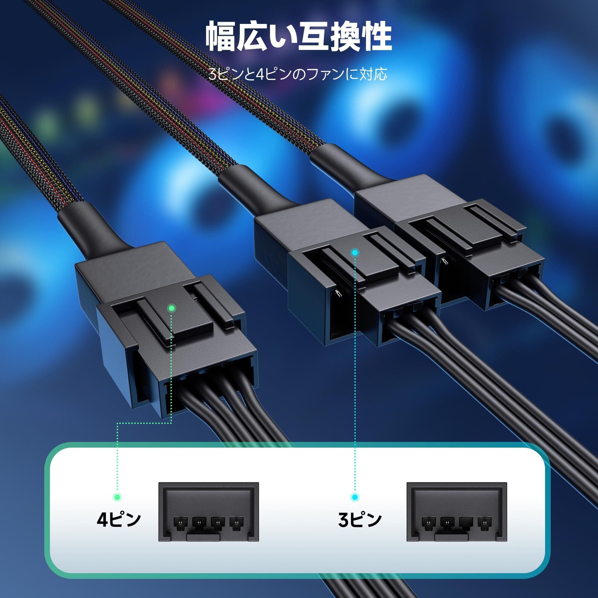 【最大6台のPWMファンと接続可能】マザーボード 4ピンレセプタクルはマザーボードの4ピンヘッダーに接続し、信号を3台のPWMファンに転送可能です。ファンは、PWM制御を備えたマザーボードのソフトウェアを使用して同じ速度で回転できます。2本セットのPWMファン用3分岐ケーブルは最大6台のPWMファンと接続でき、多数のファンを使用する方におすすめします。