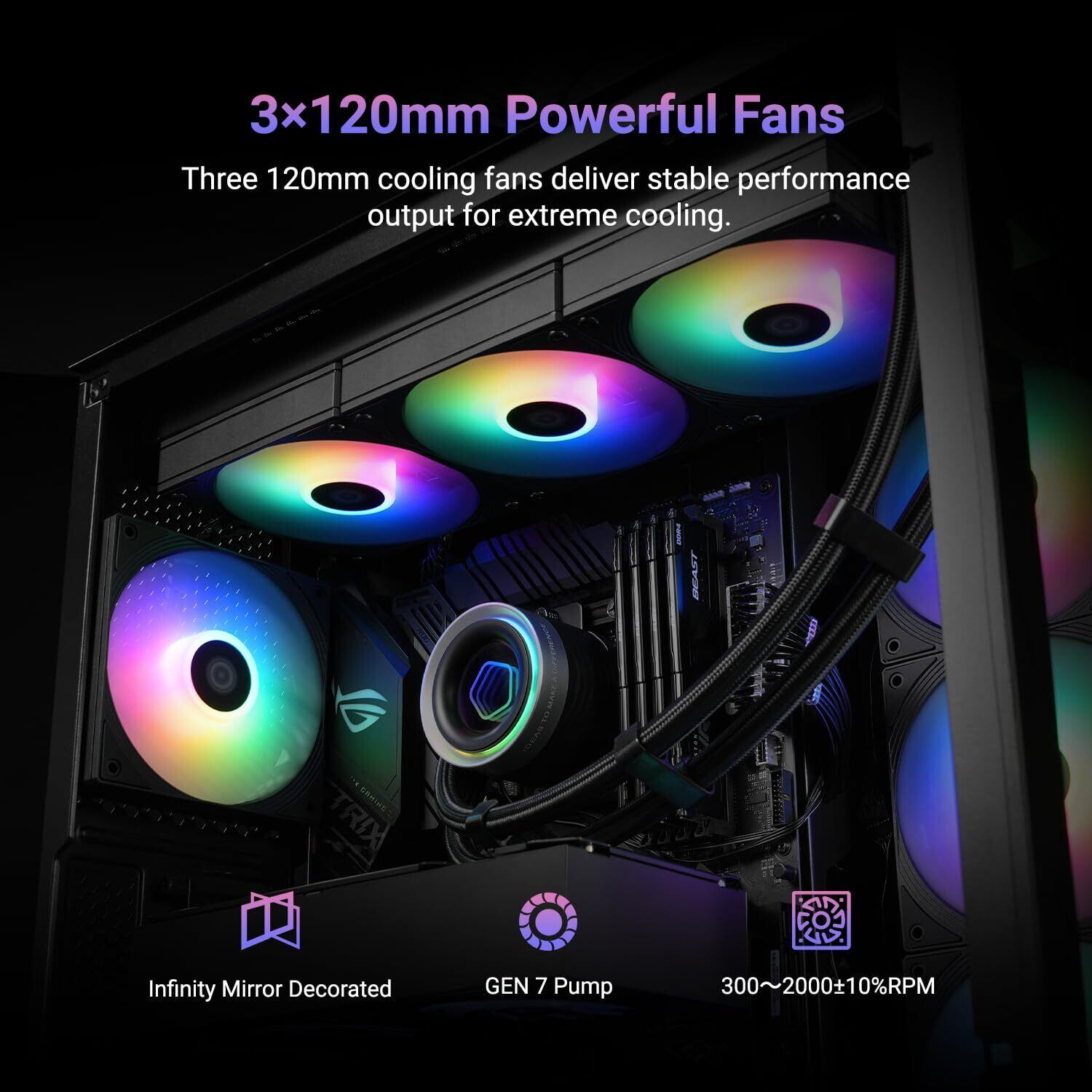 【プレミアムAIOクーラー】360mmのラジエーターと3つの静音ファンを備えたプレミアムCPU液体クーラーで、ゲーミングや高性能コンピューティングシステムに最適です。| TDP: 350W