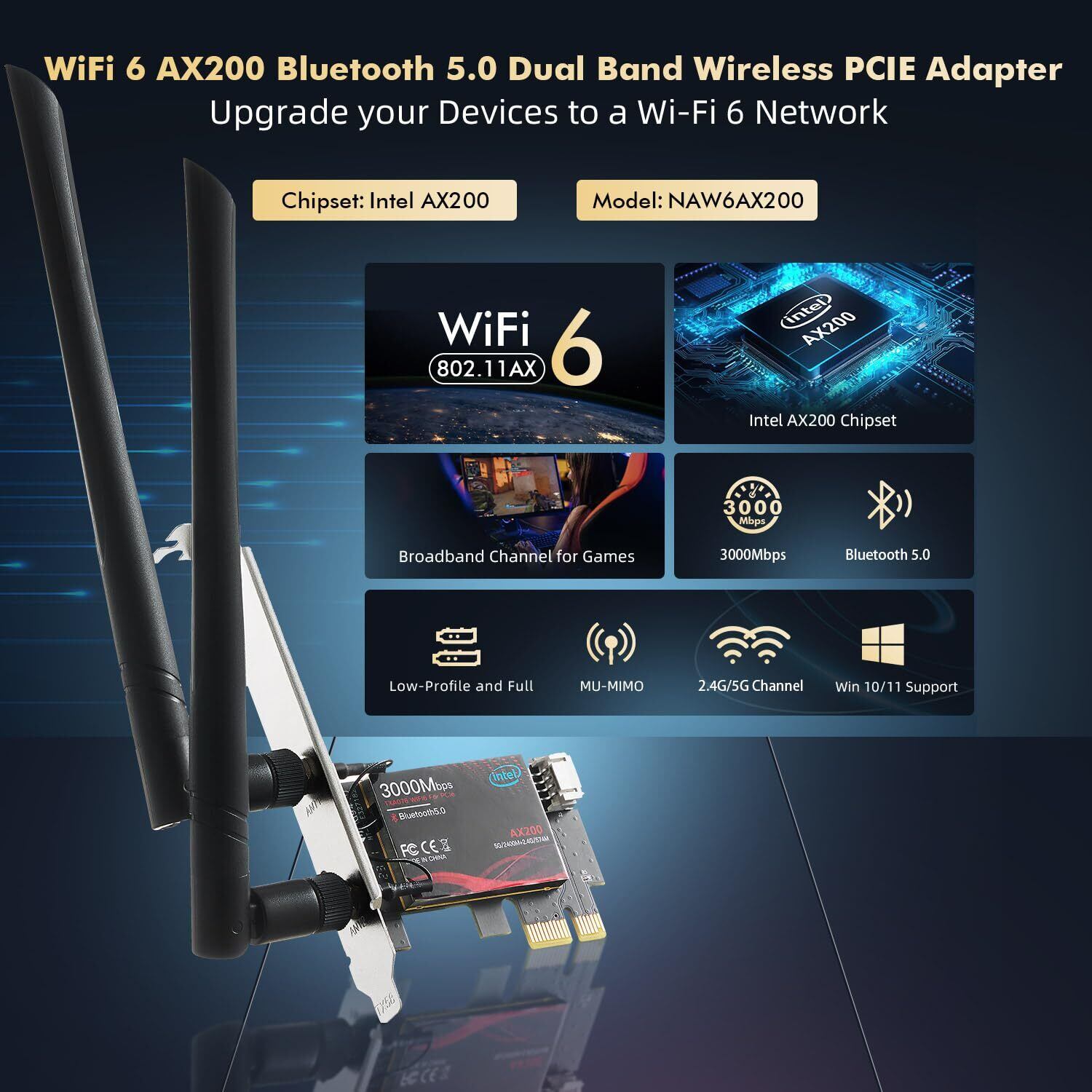 【WiFi6 3000Mbps】このWiFi6カードAX3000はIntel AX200チップセットを搭載し、WiFi6 802.11ax規格をサポートし、WiFi5/WiFi4と互換性があります。 最大3000Mbps(574Mbps @2.4GHz + 2400Mbps @5GHz)で、接続を切断することなく、シームレスなストリーミング、高速ファイル転送をサポートします。