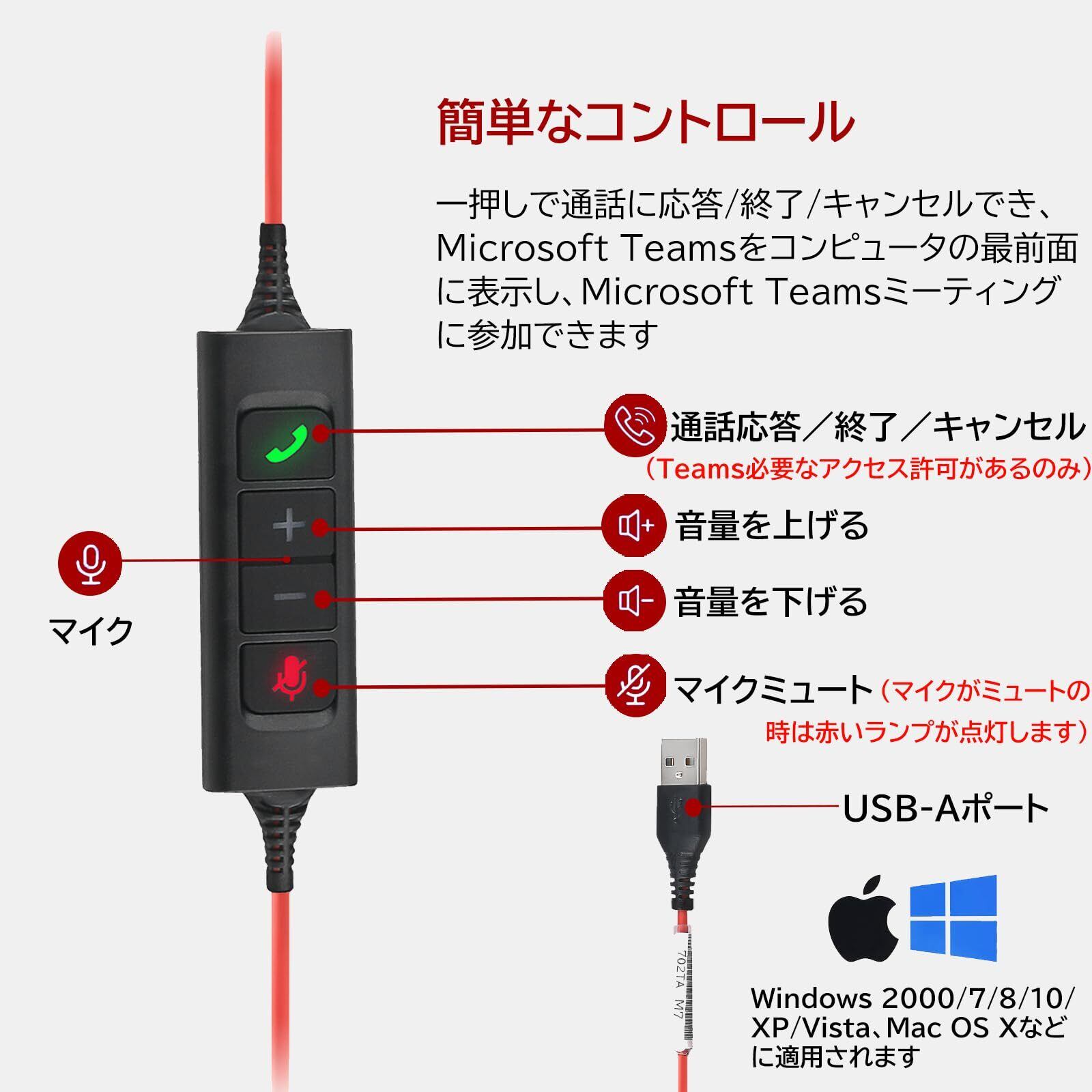 『便利なオーディオ制御』このPC用ヘッドセットは、USBケーブル側にリモコンつき、リモコンには「受話ボタン」、「マイクオン/オフ」、「音量+」、「音量ー」という全部4つのボタンがあります。通話の途中で手元でボタンを押すとミュートや音量調節できる。一押しでTeams通話に応答、終了、キャンセルしたり、ウィンドウを最前面に表示し、進行中のTeams会議に参加が可能です。